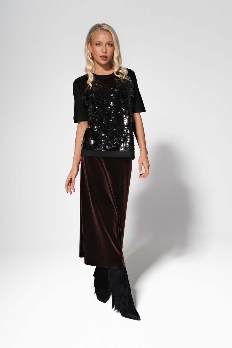 Black Sequin Knit Blouse е стилно съчетание между класически комфорт и вечерен блясък. Изработена от меко плетиво, тя осигурява топлина и удобство, а предната част, обсипана с пайети, придава изискан и празничен акцент.С къс ръкав и изчистена линия, блузата е едновременно елегантна и лесна за комбиниране — перфектна както за официални поводи, така и за модерни ежедневни визии.