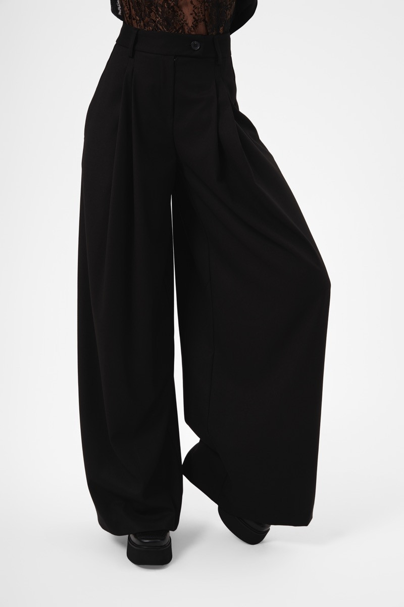 Елегантен и дръзък костюм в черен нюанс, състоящ се от двуредно сако и широк панталон с висока талия. Силуетът е едновременно структуриран и флуиден – съчетава сила и изисканост в перфектен баланс.