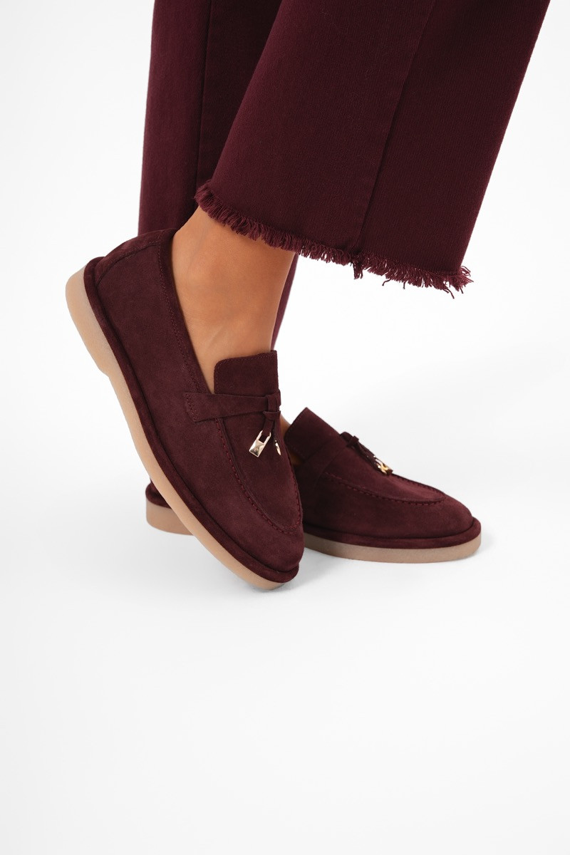 Елегантни мокасини в наситен бордо нюанс, изработени от висококачествен велур с мек и луксозен финиш. Моделът впечатлява с изчистен силует и класическа форма, подчертан с декоративен елемент в златист тон отпред, който добавя фин акцент на модерност.