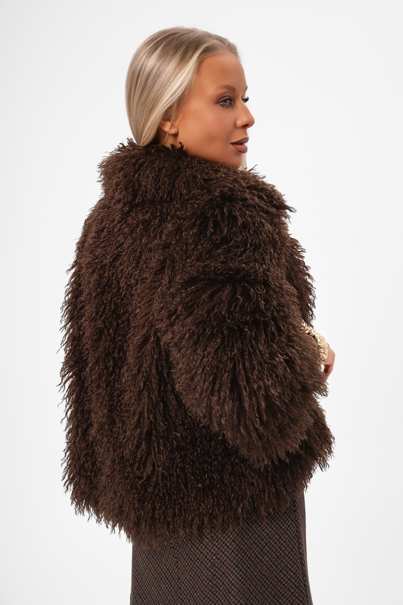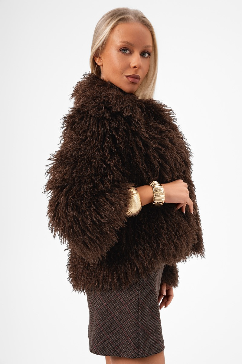 Луксозно късо палто в наситен шоколадов нюанс, изработено от пухкава еко кожа с изразителна текстура. Моделът е с обемен силует, който обгръща тялото и придава усещане за топлина и изтънченост. Впечатлява с мека, почти скулптурна визия и луксозен блясък на влакната.Палтото е декорирано с елегантна апликация във формата на листо, обсипана с камъни и мъниста в златисто-бронзов нюанс — детайл, който добавя артистичен и женствен акцент.