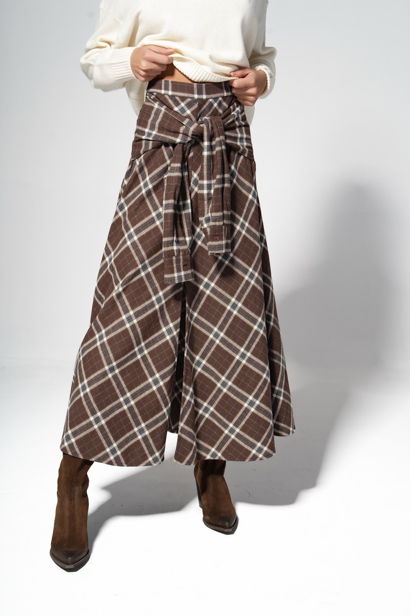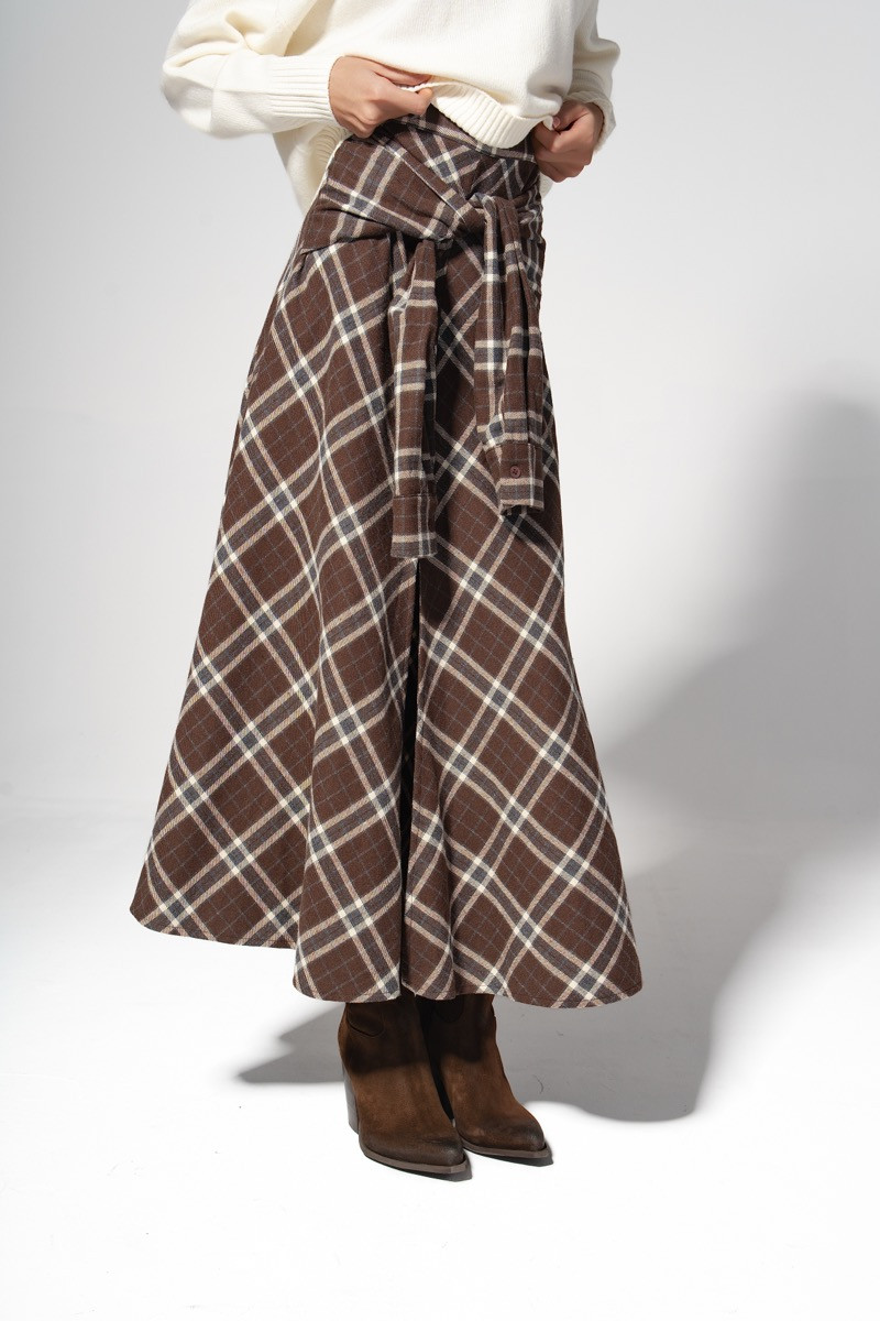 Plaid Wool Midi Skirt – Brown Check е създадена за онези моменти, когато уютът и елегантността трябва да вървят ръка за ръка. Изработена от мека вълнена материя, тя предлага топлина, структура и безупречен силует.Класическото каре в топли кафяви тонове носи усещане за вечна есенно-зимна естетика, а вграденият колан, оформен като вързана риза, добавя артистичен, модерен акцент. Дължината тип midi осигурява женствено движение и позволява лесно съчетаване с ботуши, пуловери или минималистични топове.