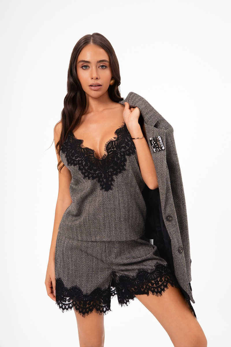 Елегантен комплект от три части, изработен от фина вълнена материя с класически рибена кост десен. Комплектът включва сако с изчистен силует и подчертани рамене, къси панталони с деликатна дантелена гарнитура по подгъва и топ с дълбоко деколте, украсен с изискана черна дантела. Контрастът между строгата текстура на плата и нежните дантелени детайли придава на визията модерен, но изтънчен характер — съчетание на женственост и увереност, подходящо за специални събития или елегантни вечери.