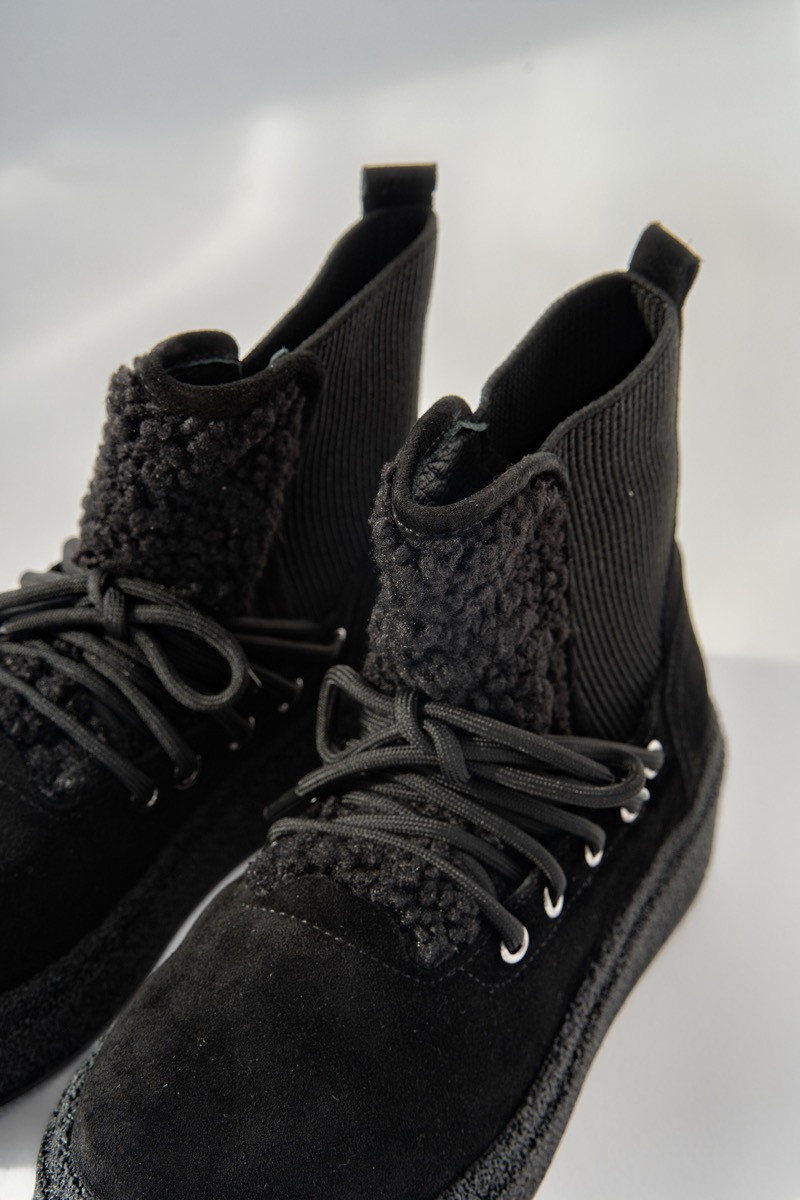 Създадени за градската зима, Urban Shearling Boots – Black комбинират топлина, модерен дизайн и функционалност в един впечатляващ силует.Изработени от мек черен велур, тези боти се отличават с плътна, пухкава езичева част и еластични оребрени панели, които осигуряват комфортно прилягане и улесняват обуването. Леката, обемна подметка добавя стабилност и характер, а шнуровката с метални капси придава модерен, градски акцент.