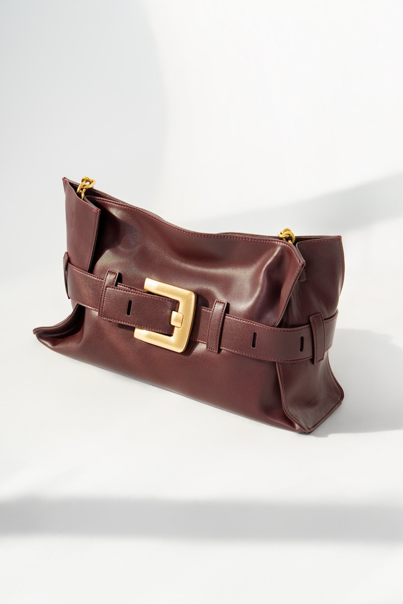 Belt Luxe Bordeaux е чанта от естествена кожа, която впечатлява с характерен силует и смело присъствие. Моделът съчетава мека, луксозна кожа в дълбок бордо нюанс с масивна декоративна катарама в матово злато – акцент, който превръща всеки аутфит в стилово изявление. Конструкцията е едновременно елегантна и функционална, позволявайки комфортно носене на рамо или в ръка.