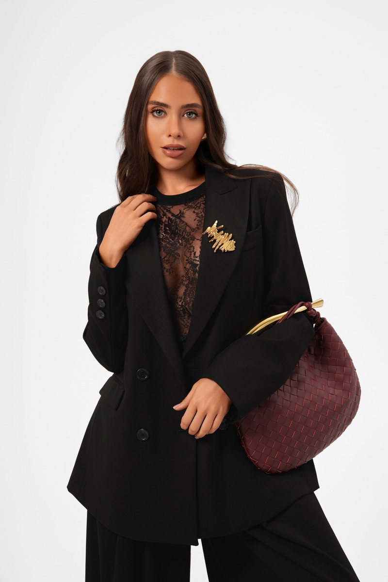 Елегантна чанта в дълбок бордо нюанс, изработена от мека кожа с изразена плетена текстура, която придава усещане за лукс и изтънченост. Моделът е с компактна, закръглена форма, която балансира между модерен дизайн и класическа женственост.