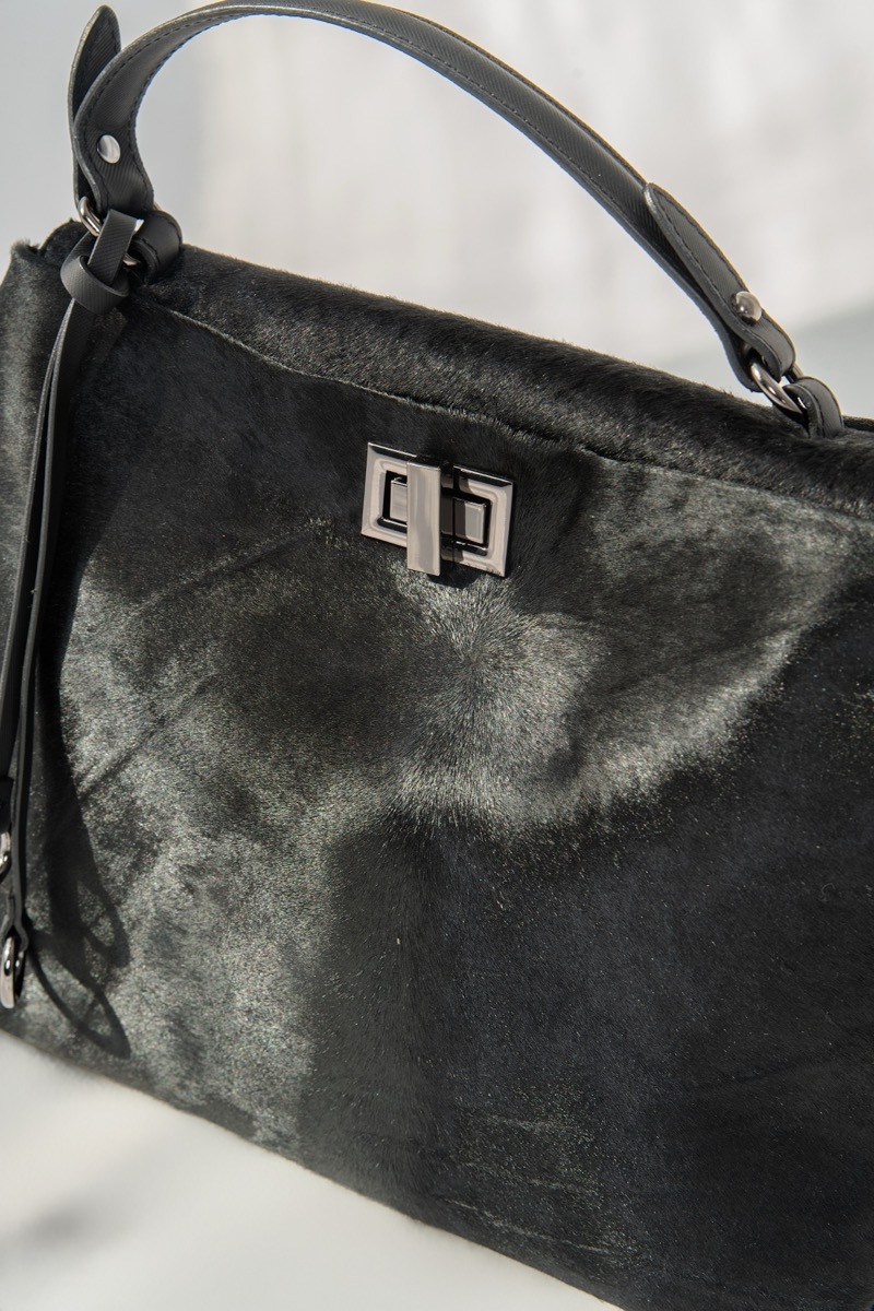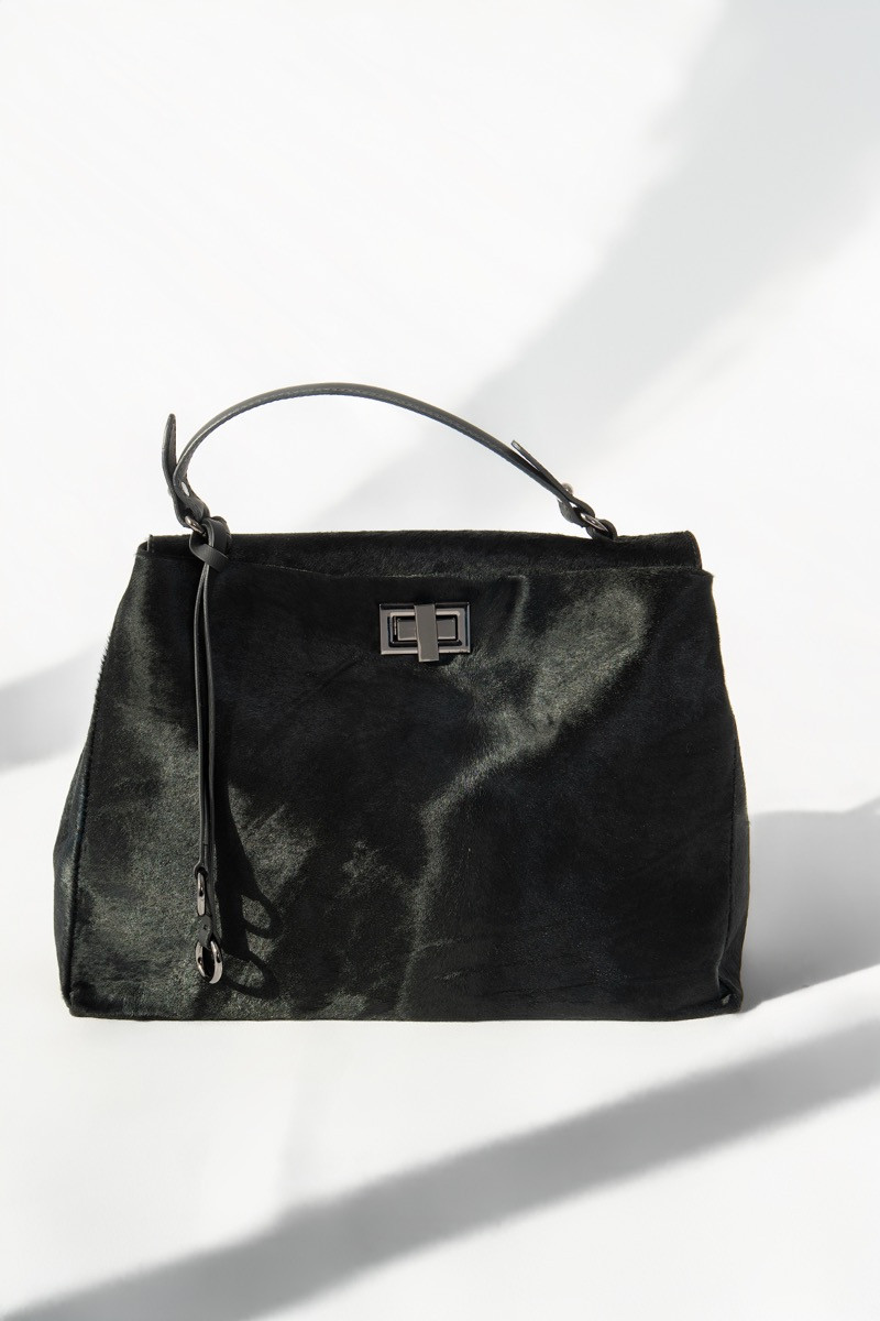 Noir Pony Luxe Bag е изискана чанта с архитектурен силует и луксозна текстура от естествен косъм от пони. Материята има фин блясък и променя отражението си според светлината, което придава дълбочина и характер на черния цвят.Моделът е със стабилна конструкция, която запазва формата си и добавя усещане за премиум завършеност.