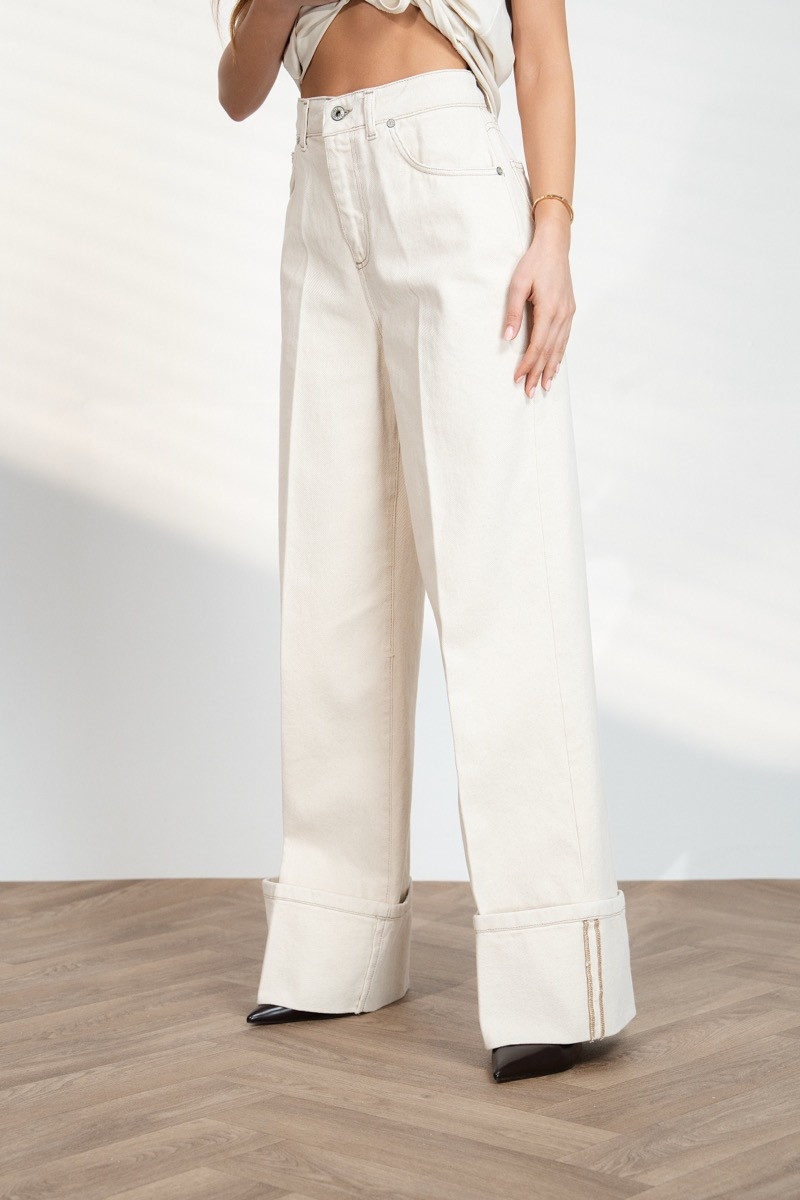 Модерни дамски дънки в елегантен светъл нюанс, които съчетават комфорт и изчистен стил. Моделът е с висока талия и широка кройка на крачолите, създаваща издължен и стилен силует. Отличителният широк подгъв придава модерен акцент и прави дизайна още по-впечатляващ.Тези дънки са перфектни за създаване на елегантни ежедневни визии и лесно се комбинират с ризи, топове или пуловери за стилна и модерна комбинация. ?✨