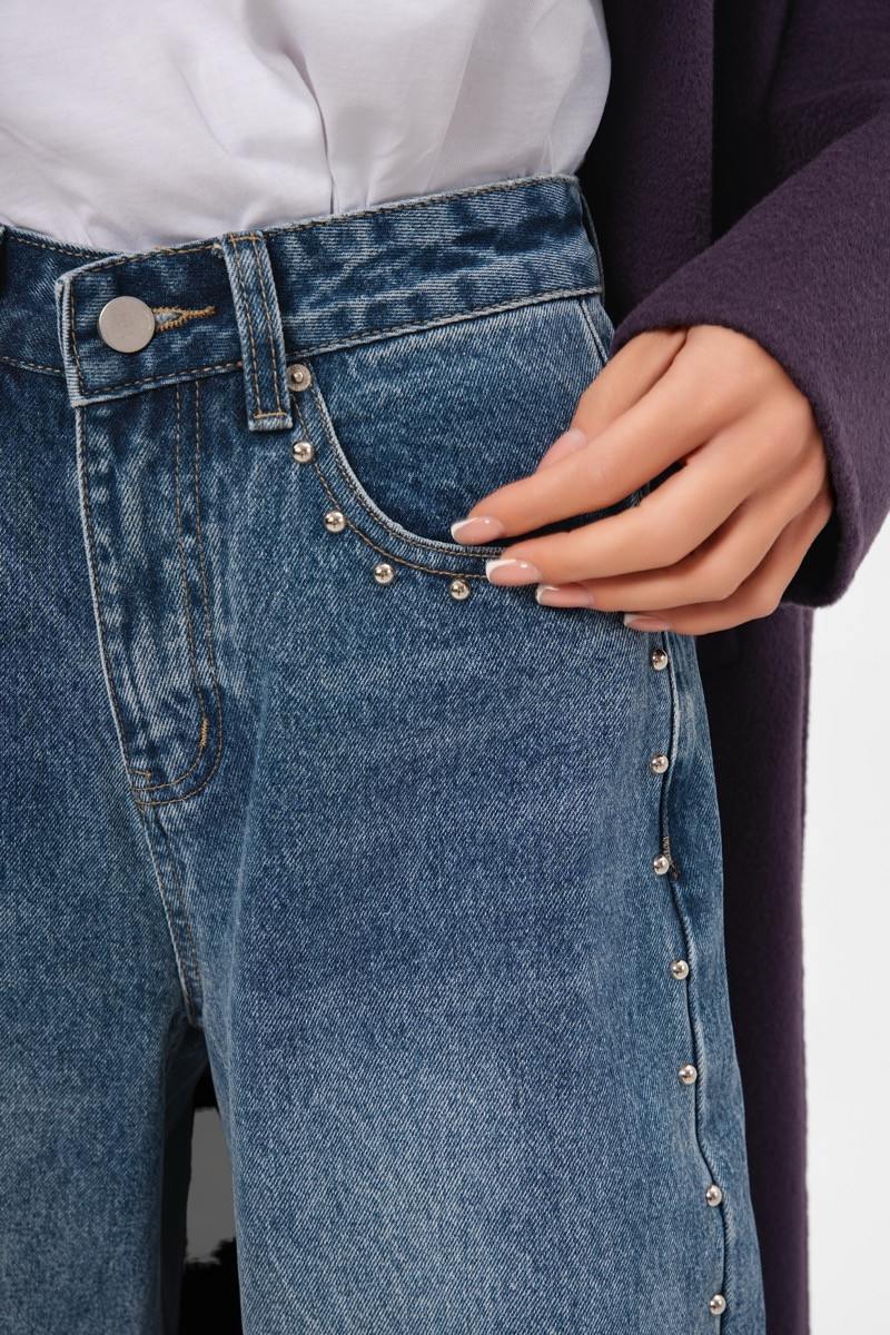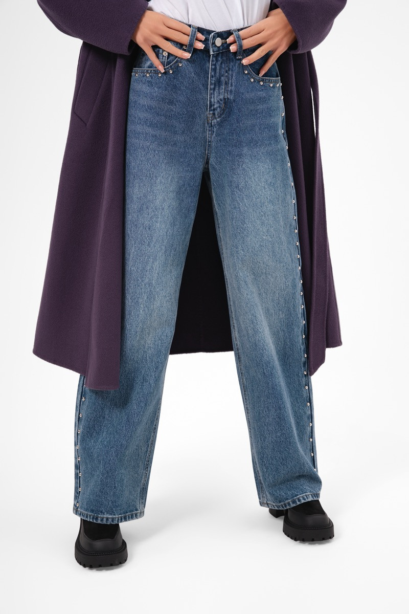 Дънки с висока талия и широк прав силует, изработени от висококачествен светъл деним. Металните елементи по шевовете добавят изтънчен детайл, а свободната линия осигурява комфорт и елегантно излъчване.