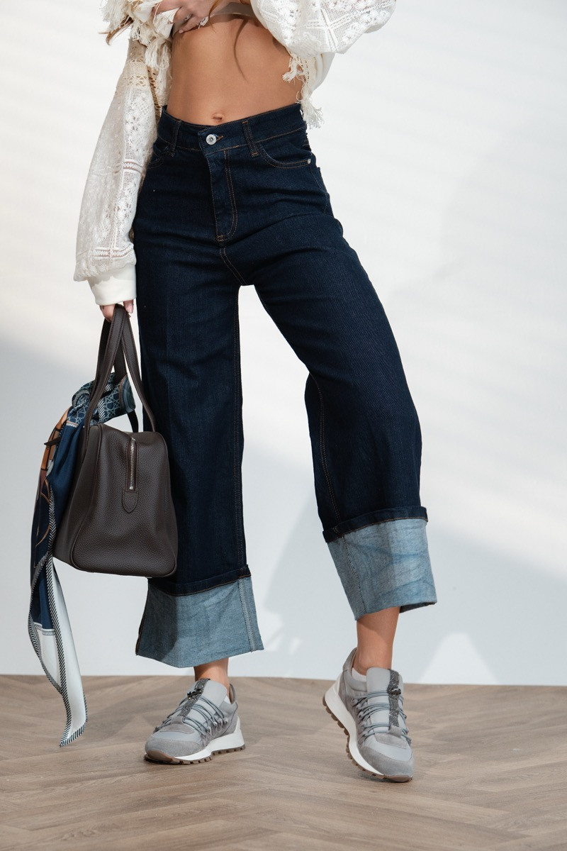 Модерни дамски дънки в тъмносин деним, съчетаващи стил и комфорт. Моделът е с висока талия и свободна кройка, която подчертава силуета и осигурява удобство през целия ден. Отличителният широк подгъв придава актуален и модерен акцент, който прави визията по-интересна и стилна.