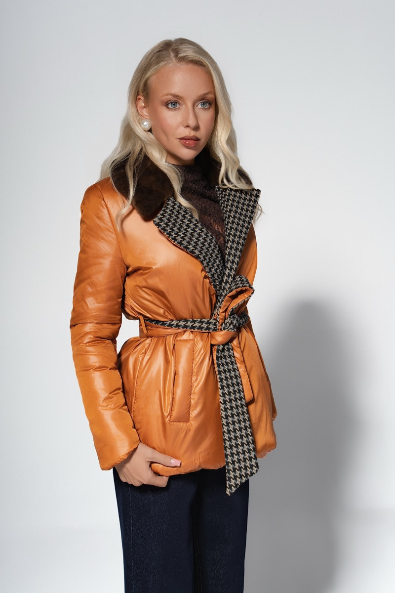 Впечатляващо дамско зимно яке, създадено за жени, които ценят комбинацията между елегантност и комфорт. Моделът е изработен от висококачествен водоотблъскващ материал в топъл кехлибарен цвят, който придава луксозно излъчване и модерна визия.Акцентът е изисканата яка от естествена норка, която носи усещане за класа и финес. Двулицевият десен на реверите и колана в класически „пиемонт“ мотив добавя модерен контраст и подчертава силуета. Коланът позволява лесно регулиране на талията, оформяйки женствена линия.