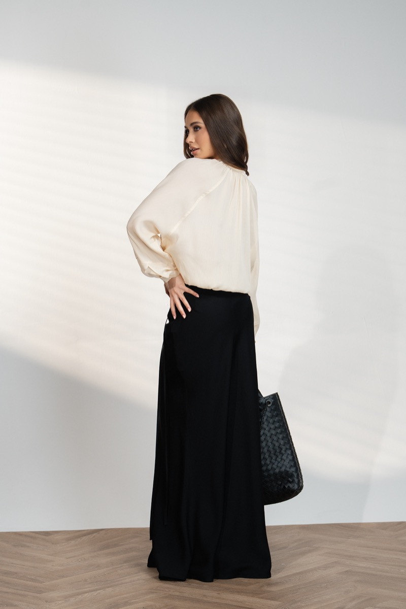 Елегантно дамско яке-риза с ефирна материя и модерна свободна кройка. Моделът е с дълъг ръкав и декоративно пристягане в долната част, което позволява регулиране и придава стилен силует. Кремавият цвят създава нежно и изискано излъчване, което го прави лесно за комбиниране както с поли и панталони, така и с по-елегантни визии. Подходящ избор за модерна и женствена визия.