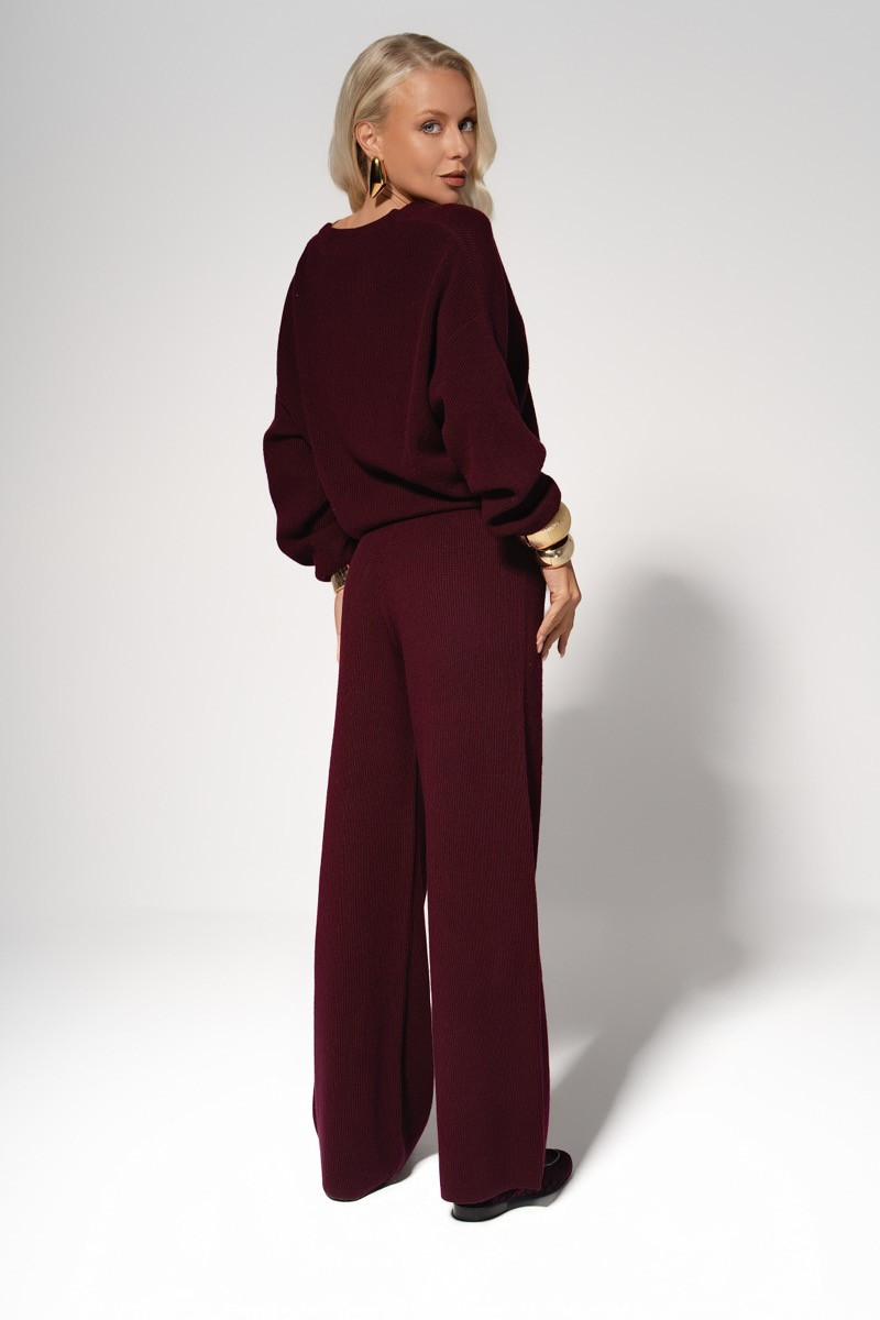 Burgundy Fine Knit Set е съвършеният баланс между комфорт и изискан стил. Изработен от фино, меко и висококачествено плетиво, този комплект обгръща тялото деликатно, без да стяга, осигурявайки усещане за уют и свобода на движението.Горната част е с елегантно V-образно деколте и леко паднали рамене, създавайки непринудена женственост. Панталонът е с висока талия и широк крачол, които издължават силуета и придават модерен, подчертано изчистен вид.