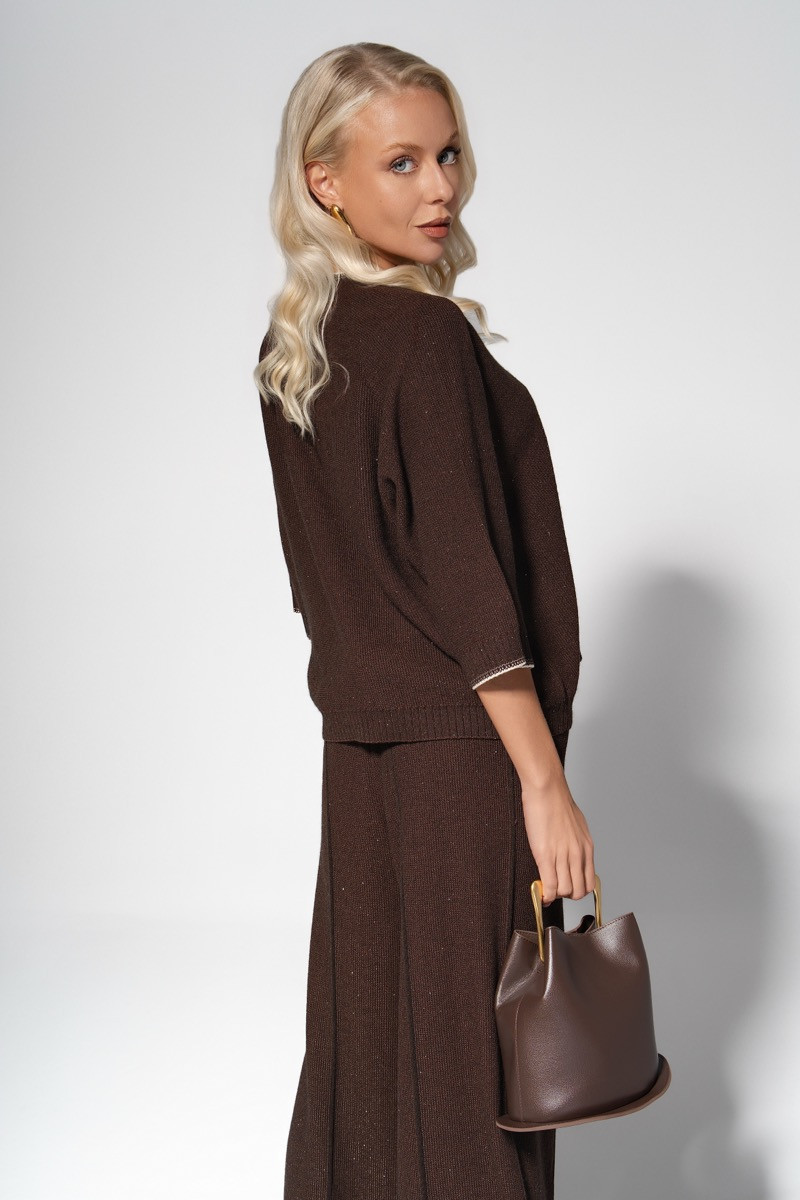Елегантен плетивен комплект, създаден за максимален комфорт и стил в ежедневието. Горната част е с модерна свободна кройка и леко разкроени ръкави, които подчертават женствената линия и придават лек, непринуден обем. Висококачествената плетена материя осигурява мекота и топлина, без да утежнява силуета.