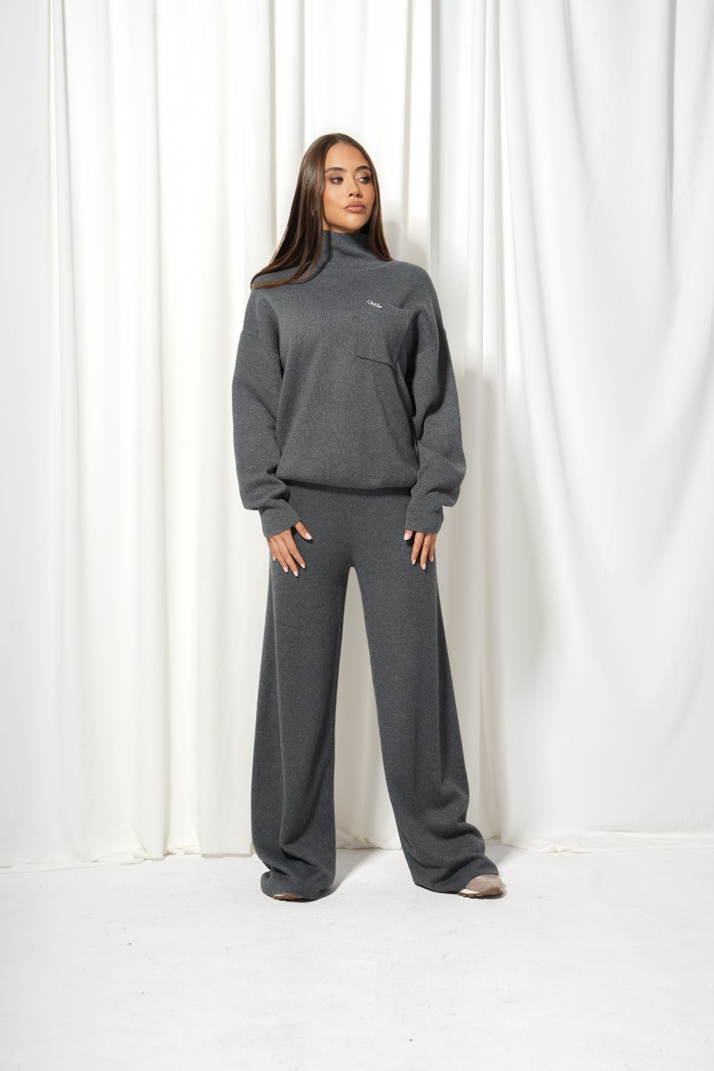 Grey Wool Knit Set е стилен и комфортен комплект, създаден за модерното ежедневие с усещане за лукс. Изработен от мека и топла вълнена плетка, той осигурява отличен комфорт и е идеален за по-хладните дни.Комплектът включва пуловер със свободна кройка и висока яка, който придава елегантен силует и леко oversized излъчване, както и широк панталон с права линия, който издължава фигурата и гарантира удобство при движение. Неутралният сив цвят прави модела изключително лесен за комбиниране – както с ежедневни обувки, така и с по-елегантни аксесоари.Перфектен избор за градска визия, пътуване или стилен casual look, този комплект съчетава функционалност, минимализъм и изискан стил.