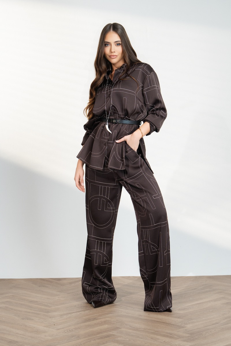 Стилен дамски комплект, състоящ се от риза и панталон с модерна свободна кройка. Ризата е с класическа яка и закопчаване с копчета, а панталонът е с широка линия и свободно падащи крачоли, които създават елегантен и издължен силует. Ефектният графичен десен придава съвременно и отличително излъчване на визията. Комплектът е подходящ както за елегантни ежедневни комбинации, така и за модерна градска визия. Коланът не е включен към комплекта.
