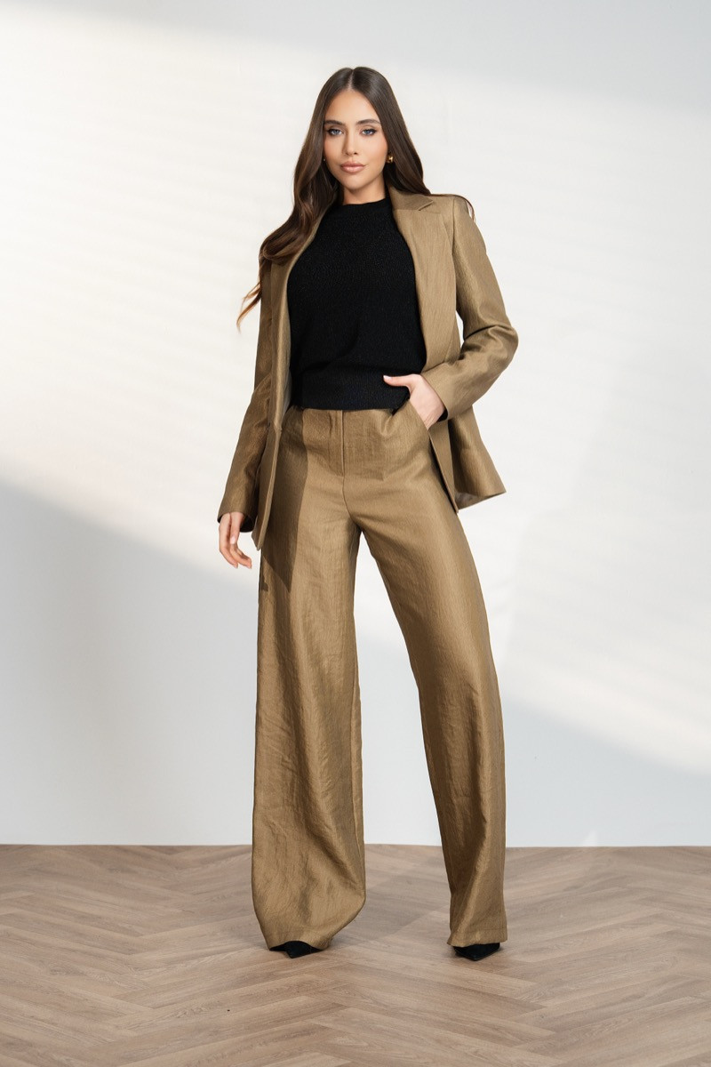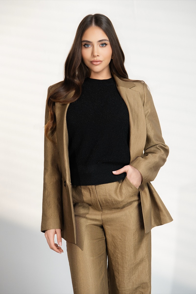 Елегантен дамски костюм, състоящ се от сако и панталон с модерна свободна кройка. Сакото е с класическа линия и копчета отпред, което придава стилна и изискана визия. Панталонът е с широка кройка и свободно падащи крачоли, които създават издължен и елегантен силует. Златисто бежовият цвят добавя луксозно излъчване и прави костюма подходящ както за официални поводи, така и за стилна градска визия.