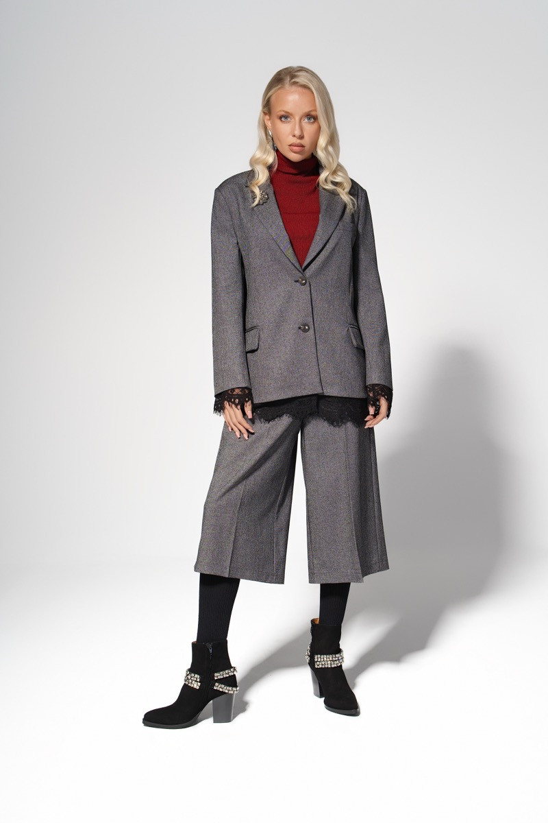 City Statement е модерен костюм, създаден за жени, които обичат силата на класиката, преплетена с висша елегантност. Сакото е със свободна, леко оверсайз кройка, която придава съвременен силует и позволява комфорт при носене. Фините ревери и декоративните джобове подчертават изчистения му характер. Панталонът тип culotte е изработен от същата висококачествена материя, осигурявайки стилна завършеност и динамична линия при движение.