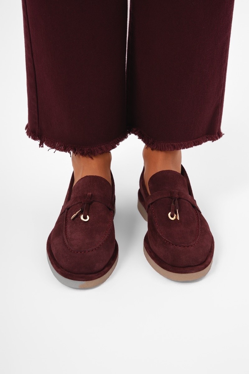 Елегантни мокасини в наситен бордо нюанс, изработени от висококачествен велур с мек и луксозен финиш. Моделът впечатлява с изчистен силует и класическа форма, подчертан с декоративен елемент в златист тон отпред, който добавя фин акцент на модерност.