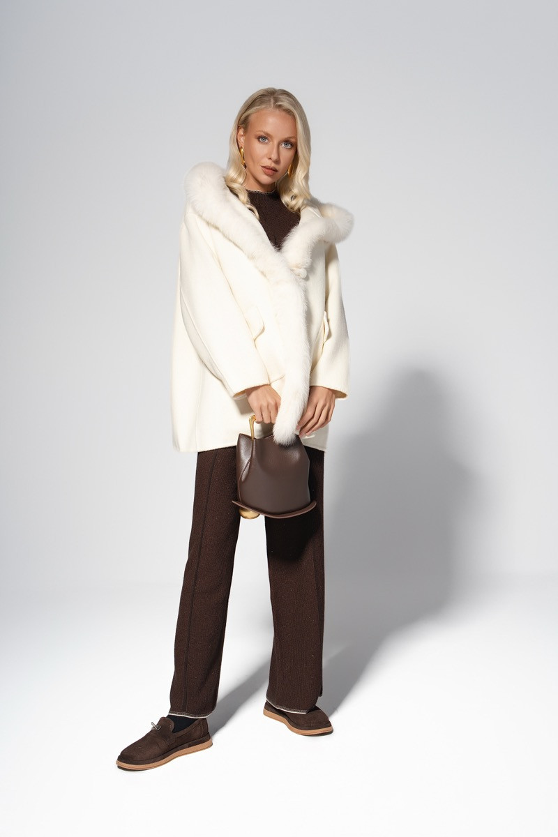 Това изключително елегантно късо палто в цвят екрю е перфектната комбинация от комфорт, стил и практичност. Моделът впечатлява с обемна качулка, обшита с естествен бял косъм, която създава аристократична визия и предлага допълнителна топлина в студените дни.Меката висококачествена материя пада красиво по тялото, а свободният силует осигурява комфорт и съвременна линия. Елегантните капаци на джобовете, фината изработка и изчистените детайли подчертават премиалния характер на палтото.