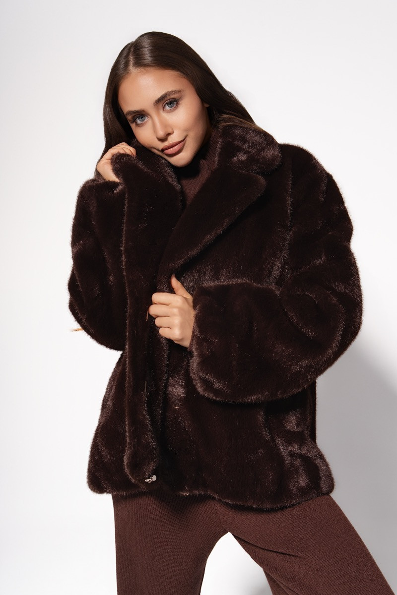 Палто в наситен тъмен шоколадов цвят, изработено от луксозна, плътна и изключително мека еко кожа. Моделът впечатлява с обемна силуетна линия, големи ревери и елегантно паднала форма, която придава модерен и богато изглеждащ завършек. Топло, комфортно и с усещане за разкош – палтото е перфектният акцент за стилни градски визии през студения сезон.