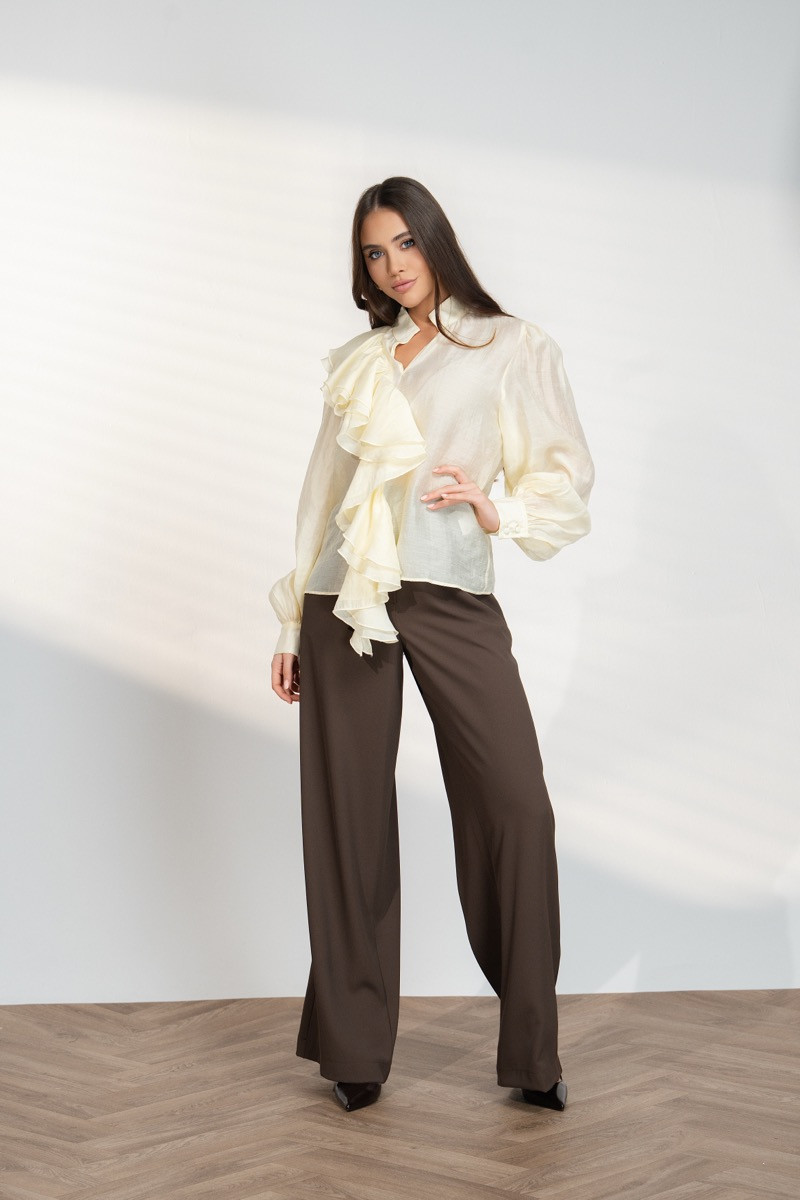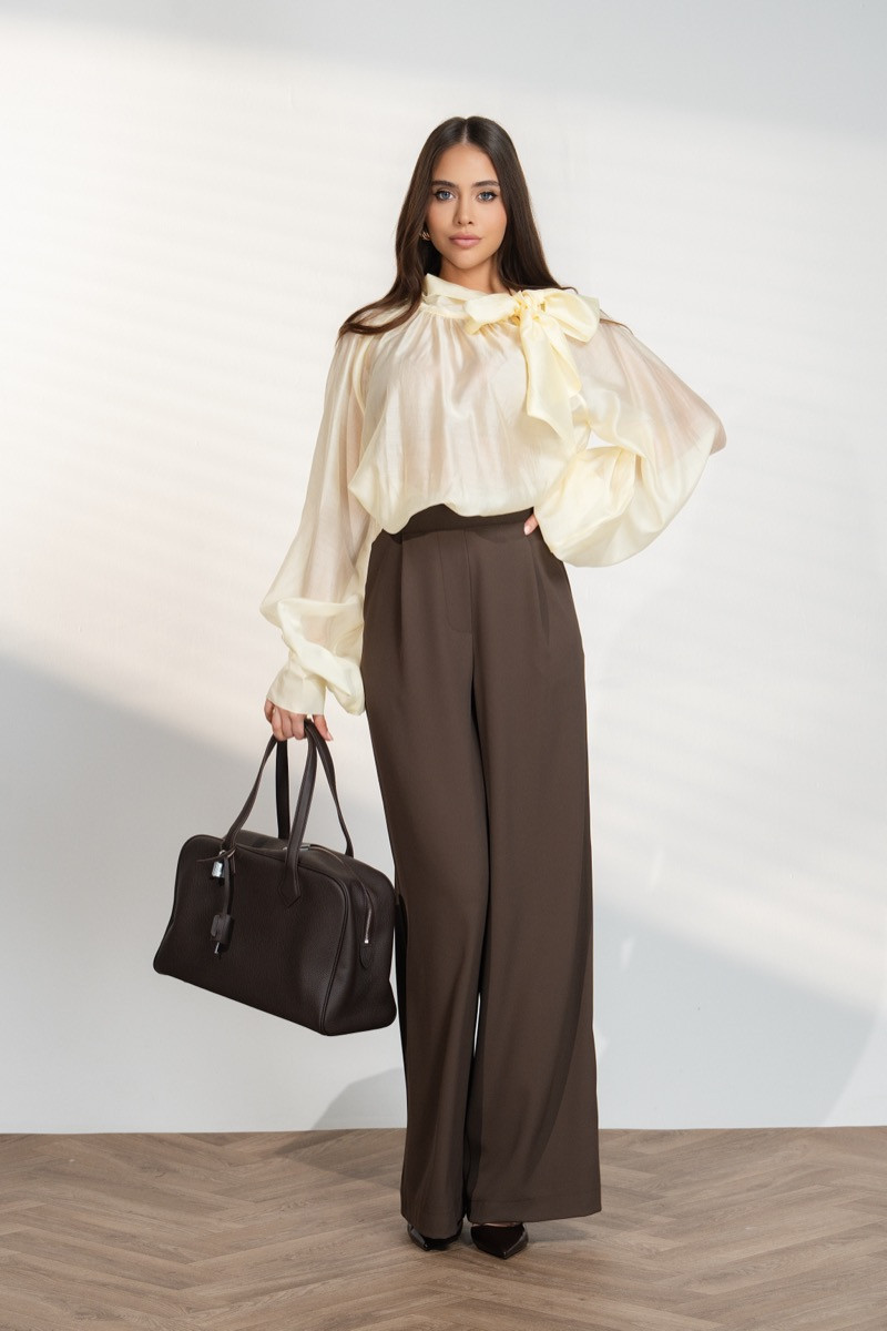 Елегантен дамски панталон с висока талия и свободна права кройка, която създава издължен и стилен силует. Моделът е изработен от приятна и лека материя, която пада красиво и осигурява комфорт при носене. Изчистеният дизайн позволява лесно комбиниране с различни ризи, топове или сака за елегантна и модерна визия.Подходящ е както за офис стил, така и за по-официални или ежедневни комбинации.