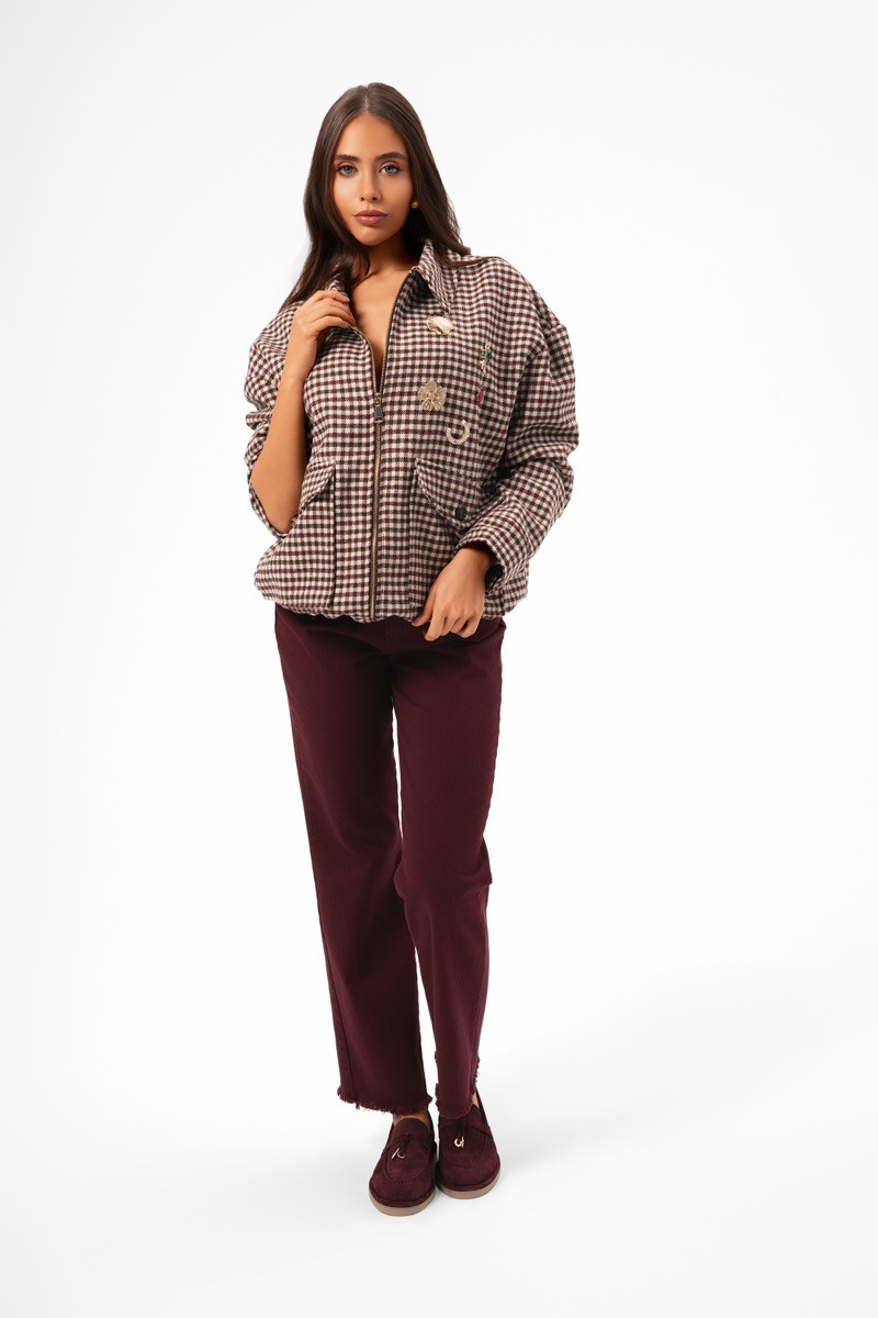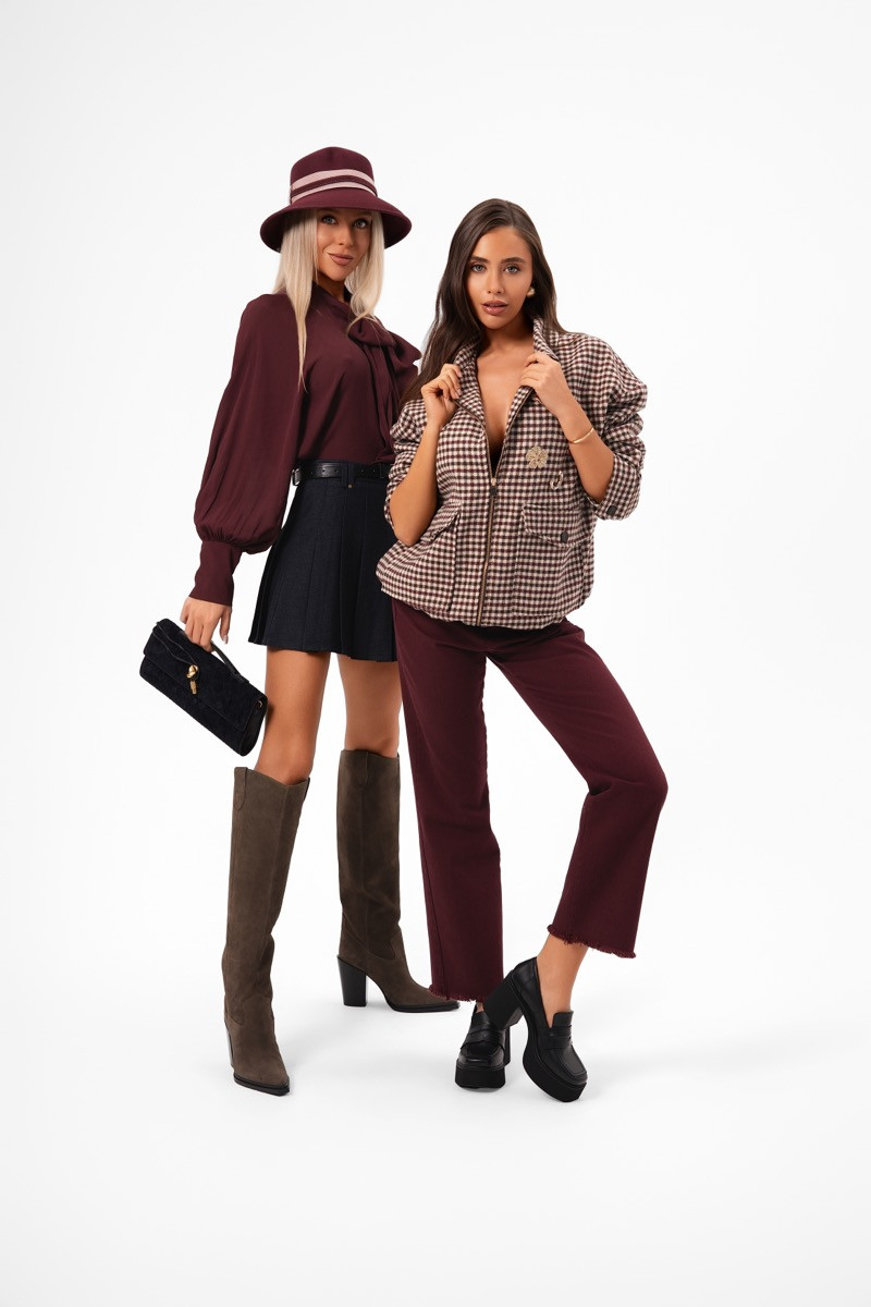 Елегантен панталон в дълбок бордо цвят, изработен от висококачествена, мека вълнена материя с лек релеф и структура. Моделът е с права, леко свободна кройка, която придава усещане за лекота и комфорт, без да губи изисканата си линия.Долната част завършва с необработен подгъв – модерен детайл, който внася съвременно и леко бохемско усещане в класическия дизайн. Средната талия и изчистената линия подчертават силуета, като осигуряват комфорт и елегантност през целия ден.
