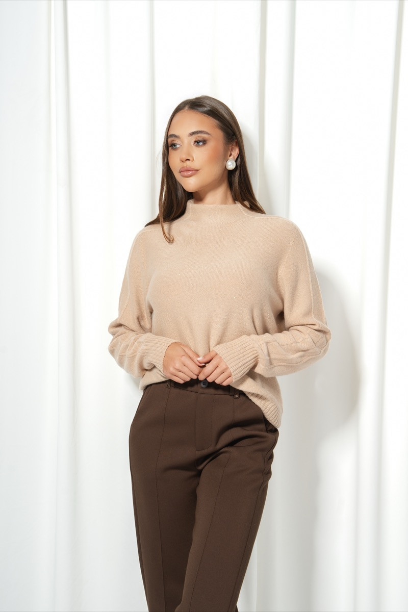 Панталон Cocoa Tailored е стилен дамски панталон в топъл кафяв нюанс, съчетаващ елегантност и комфорт. Моделът е с изчистен силует и права линия, която визуално издължава фигурата. Изработен от мека и еластична материя, панталонът осигурява удобство през целия ден, без да прави компромис със стила. Високата талия и прецизната кройка подчертават формите, а минималистичният дизайн го прави лесен за комбиниране както с пуловери и ризи, така и с по-спортни обувки за модерна градска визия.