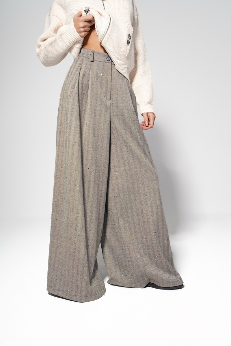 Панталон с впечатляващо широк крачол, създаден да придава силует с присъствие и изисканост. Моделът комбинира класическа линия с модерно излъчване – високата талия издължава фигурата, а дълбоките набори отпред създават красив обем и луксозно движение при всяка стъпка.Изработен от фин, структурен плат с деликатен десен, панталонът изглежда едновременно елегантно и effortlessly chic. Подходящ е както за ежедневни комбинации с меки пуловери, така и за по-официални визии в градски стил.