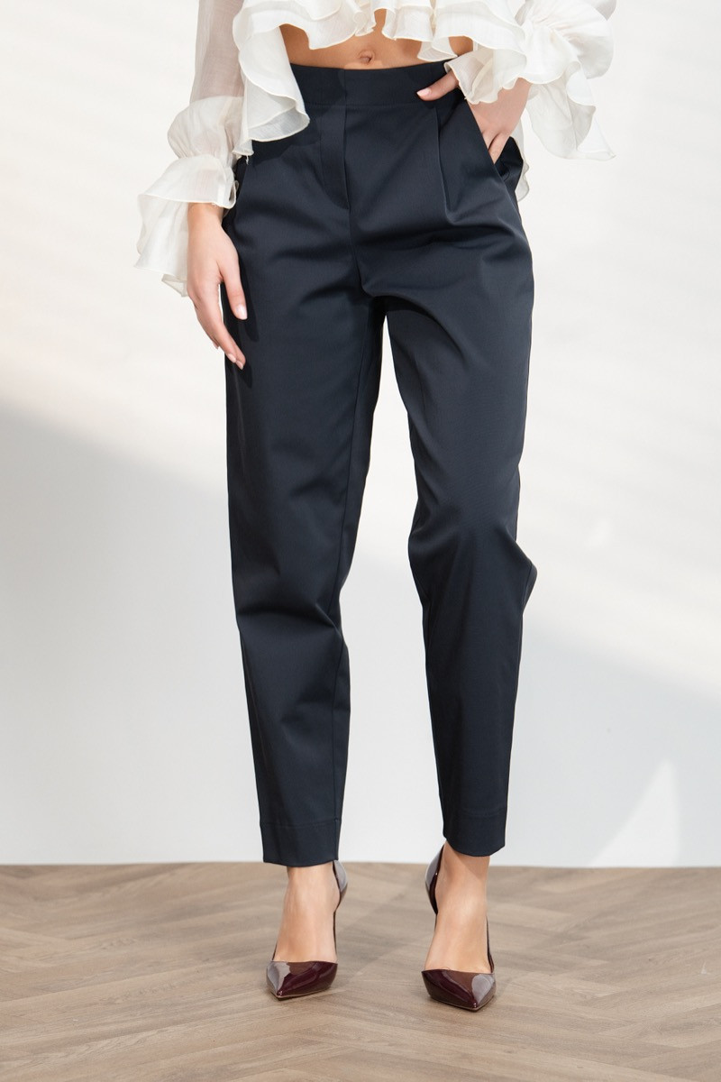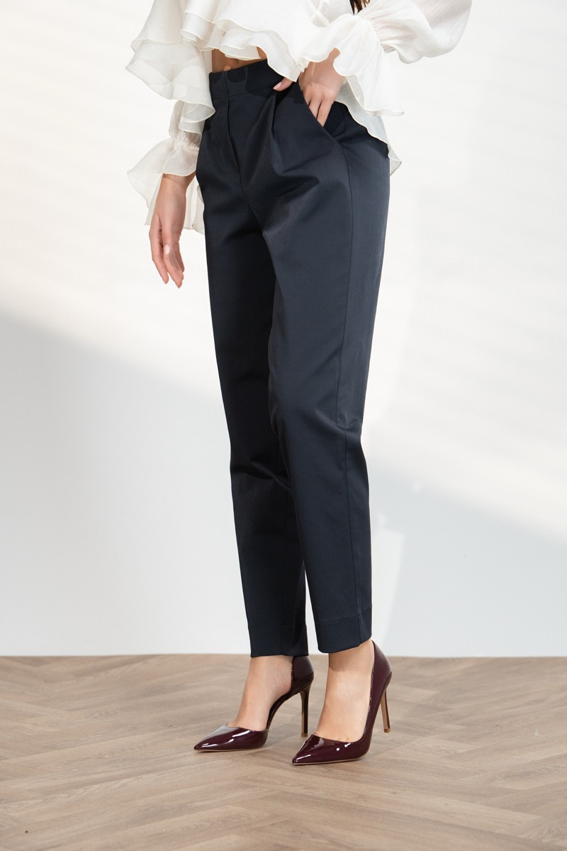 Елегантен дамски панталон с изчистена линия и модерна кройка, създаден да подчертава силуета и да осигурява комфорт през целия ден. Моделът е с висока талия и стилни ръбове по дължината на крачолите, които придават изискан и издължен вид на фигурата. Тъмносиният цвят го прави лесен за комбиниране както с елегантни ризи и блузи, така и с по-ежедневни топове за стилна градска визия.