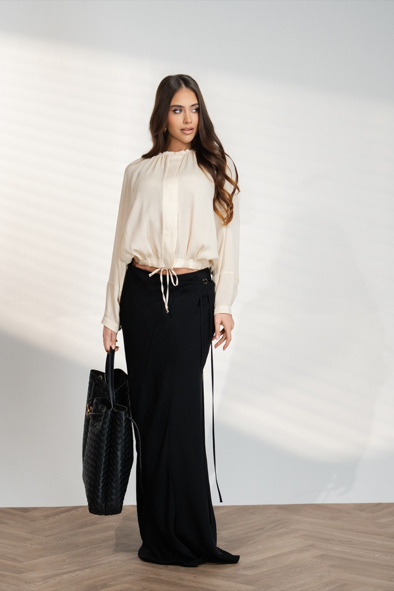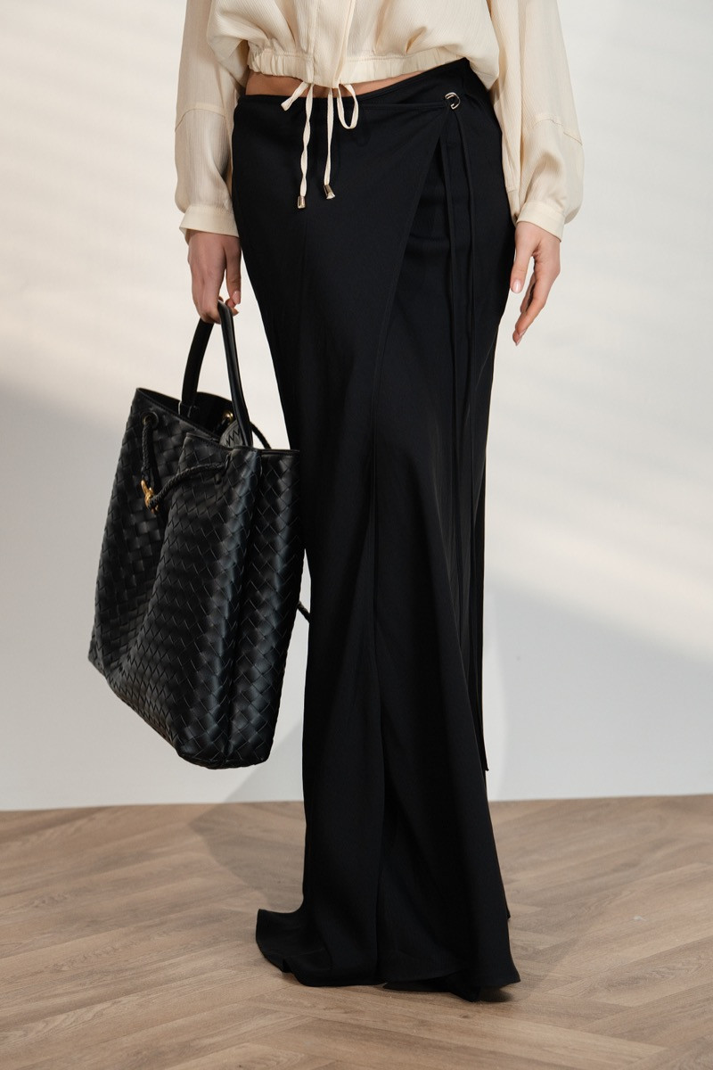 Елегантна дамска пола с дълга линия и стилен силует, който подчертава фигурата. Моделът е с декоративно завързване в талията и ефектна цепка, които придават модерно и женствено излъчване. Свободно падащата материя създава красиво движение при ходене, а класическият черен цвят позволява лесно комбиниране както с елегантни ризи и блузи, така и с по-изискани вечерни визии.
