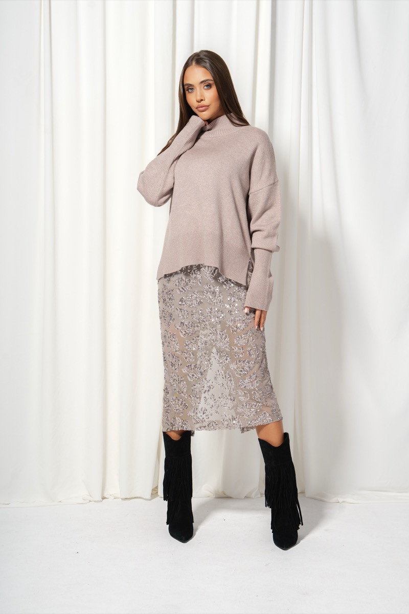 Елегантен пуловер с изчистен и модерен силует, създаден за максимален комфорт и стил. Моделът е изработен от фино плетена, мека и приятна на допир материя с вълна, която осигурява топлина и усещане за лукс през по-хладните дни.Свободната кройка с леко паднало рамо и висока яка придава съвременна визия и позволява лесно комбиниране както с елегантни поли, така и с панталони или дънки. Дългите ръкави с маншети и правият подгъв завършват дизайна с балансирана изисканост.