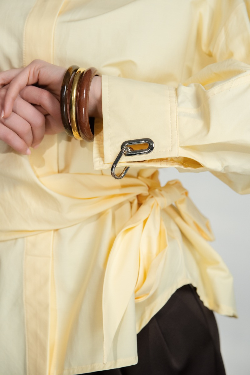 Елегантна дамска риза с модерна и женствена визия. Моделът е изработен от лека и приятна материя, която осигурява комфорт и красиво падаща линия. Ризата е с класическа яка, дълги ръкави с маншети и ефектен колан за връзване в талията, който подчертава силуета и придава стилен акцент. Нежният жълт цвят добавя свежест и лекота към визията, което я прави подходяща както за ежедневни, така и за по-елегантни комбинации.