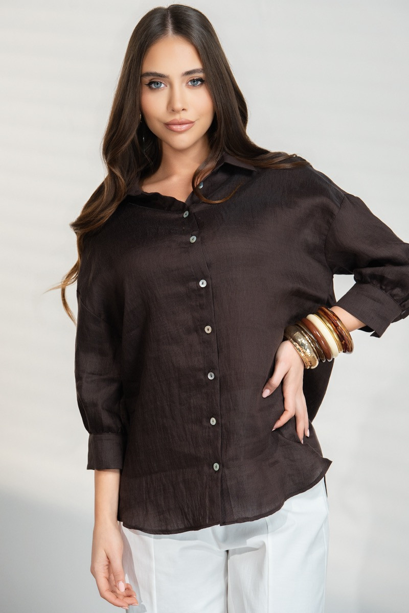 Елегантна дамска риза с изчистен дизайн и свободна кройка, която осигурява комфорт и стилна визия. Моделът е с класическа яка, закопчаване с копчета и дълъг ръкав. Леката и ефирна материя придава меко движение на силуета, а тъмнокафявият цвят създава изискано и модерно излъчване. Ризата е подходяща както за елегантни комбинации с панталон или пола, така и за стилна ежедневна визия.