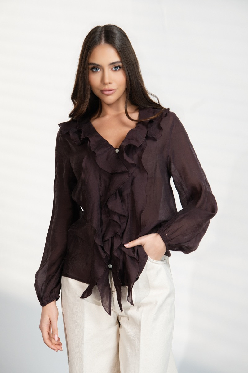 Елегантна дамска риза в дълбок кафяв цвят, изработена от лека и ефирна материя, която придава нежност и женственост на визията. Моделът се отличава с красиви волани по деколтето, които създават стилен и романтичен акцент. Свободната линия и фината прозрачност правят ризата подходяща както за ежедневни комбинации, така и за по-елегантни визии. Лесно се съчетава с панталони или поли и добавя изискано излъчване към всеки тоалет. ✨