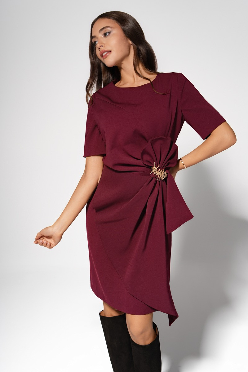 Ariana е елегантна рокля с къс ръкав, създадена за жени, които ценят стила и изтънчените детайли. Моделът впечатлява със своя наситен бордо нюанс и прецизна кройка, която подчертава фигурата по деликатен и женствен начин.Централният акцент е артистичната драпировка в талията, оформена като обемна панделка и завършена с изящна златиста апликация. Този детайл не само придава характер, но и създава оптически издължен силует. Дължината над коляното прави роклята подходяща както за официални събития, така и за стилни вечери.