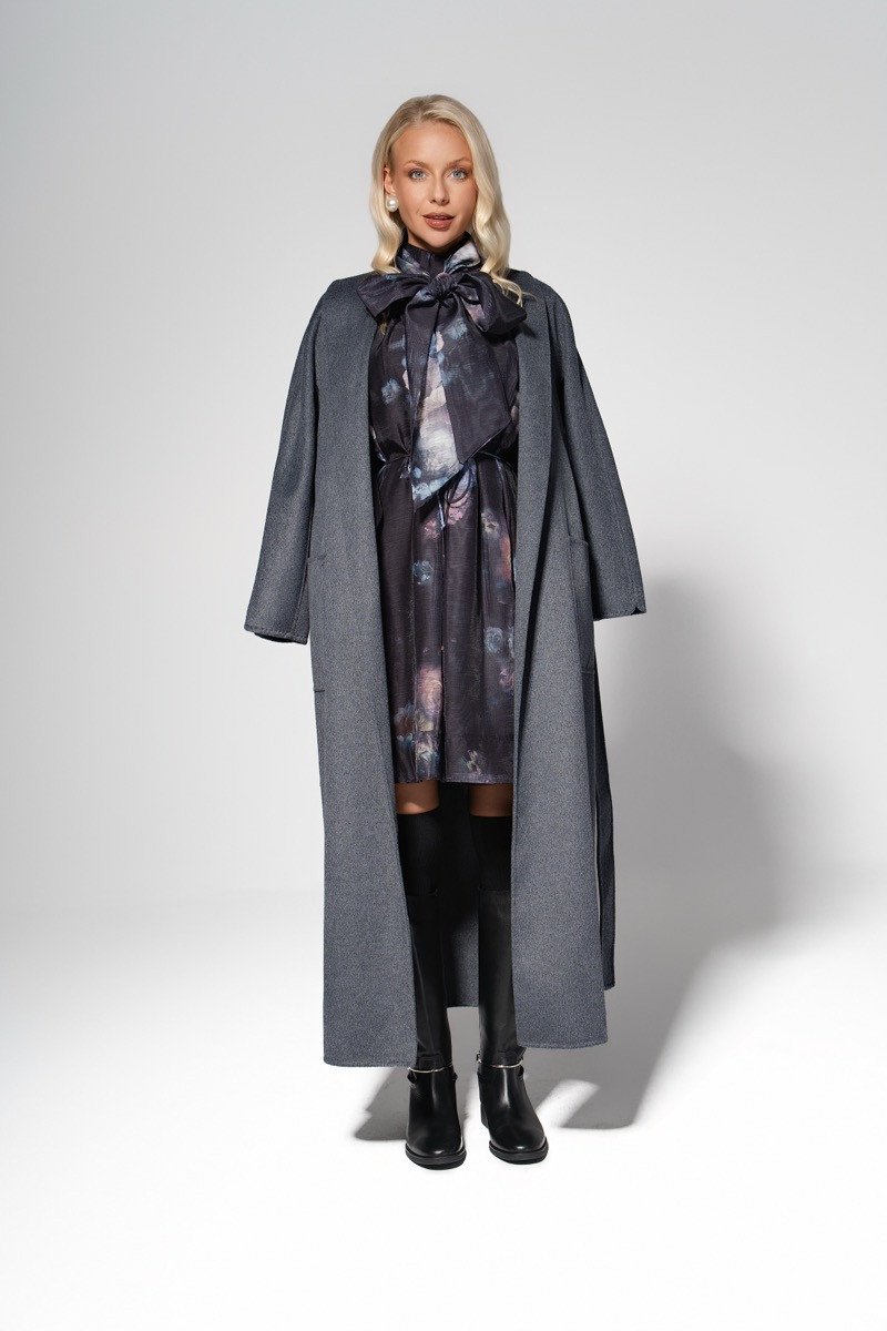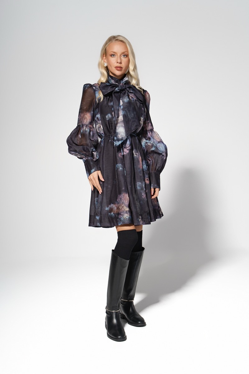 Ефирна дамска рокля в уникален художествен принт, оформена в тъмна, мистична цветова гама с нюанси на синьо, лилаво и розово. Моделът впечатлява с голяма панделка на врата, която добавя елегантност и ретро акцент, както и с обемни прозрачни ръкави, завършващи с маншети за структурирана линия.Роклята е с лека А-силуетна кройка, която пада свободно и ефектно, подчертавайки фигурата без да прилепва. Меката, фина материя придава лекота и елегантно движение при всяка стъпка.