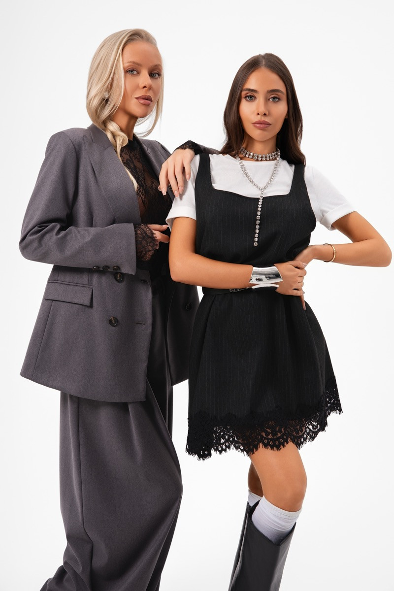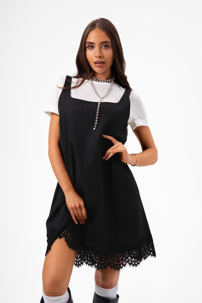 Къса рокля в класическо черно, изработена от фин плат с деликатна структура. Дизайнът е с изчистена линия и женствен силует, допълнен от елегантна дантела по подгъва, която придава леко ретро излъчване. Моделът е комбиниран с бяла тениска за модерен, младежки контраст и завършен с перлени акценти за нотка шик. Подходяща както за ежедневието, така и за вечерни поводи.