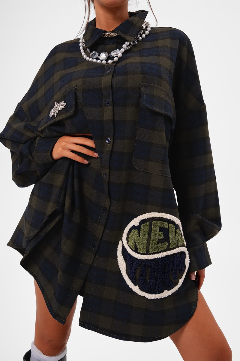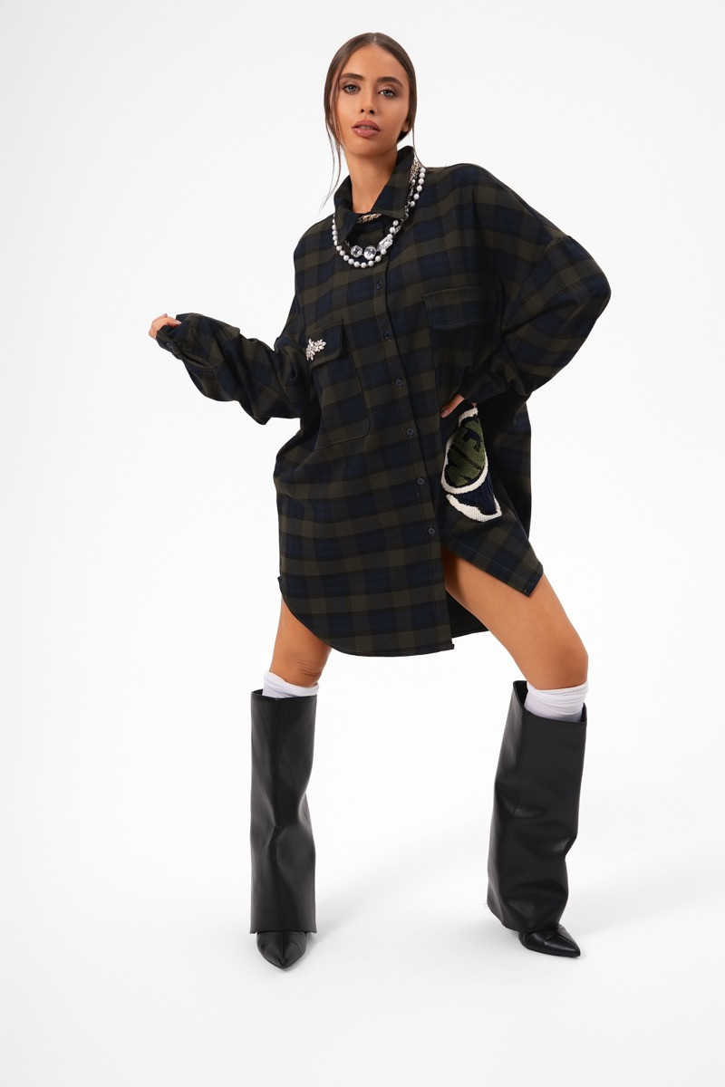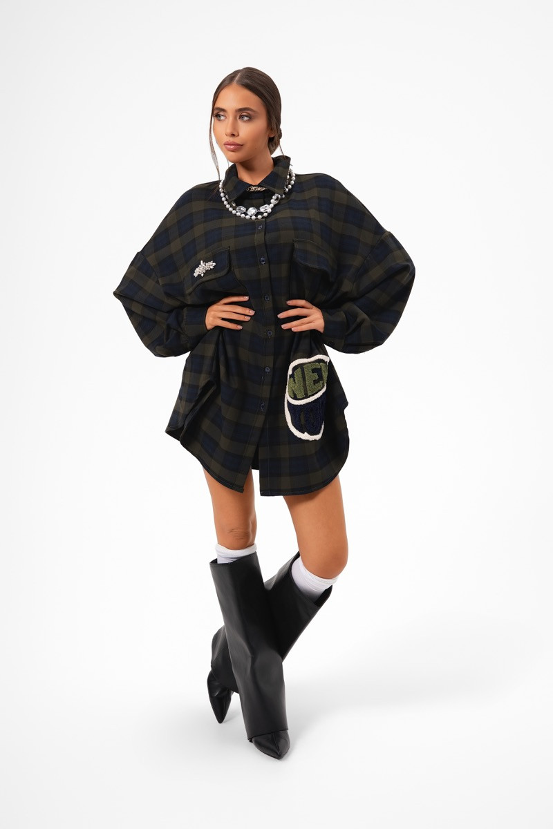 Рокля-риза в каре с подчертана oversize кройка. Моделът комбинира комфорт и характер, като съчетава небрежен силует с изразена модна индивидуалност. Изработена от мека и плътна материя, подходяща за преходните сезони. Декоративните апликации и брошка придават артистичен акцент и отличителен почерк.Може да се носи както като самостоятелна рокля, така и като риза върху панталон или къси панталонки — за модерен, многопластов стайлинг.