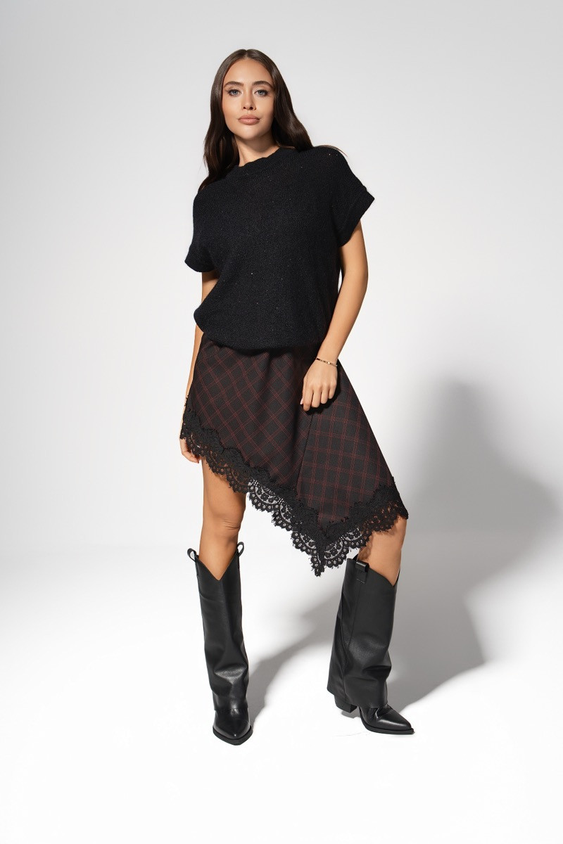 Nocturne Lace е стилна рокля тип slip dress, съчетаваща елегантно каре в тъмни нюанси и богата черна дантела. Асиметричният подгъв добавя модерна линия и подчертава движението, докато деликатните тънки презрамки и дантеленият бюст създават женствен, леко романтичен силует.
