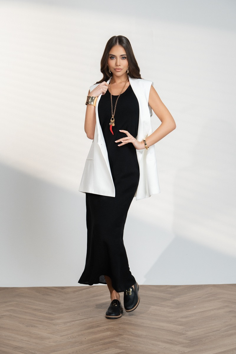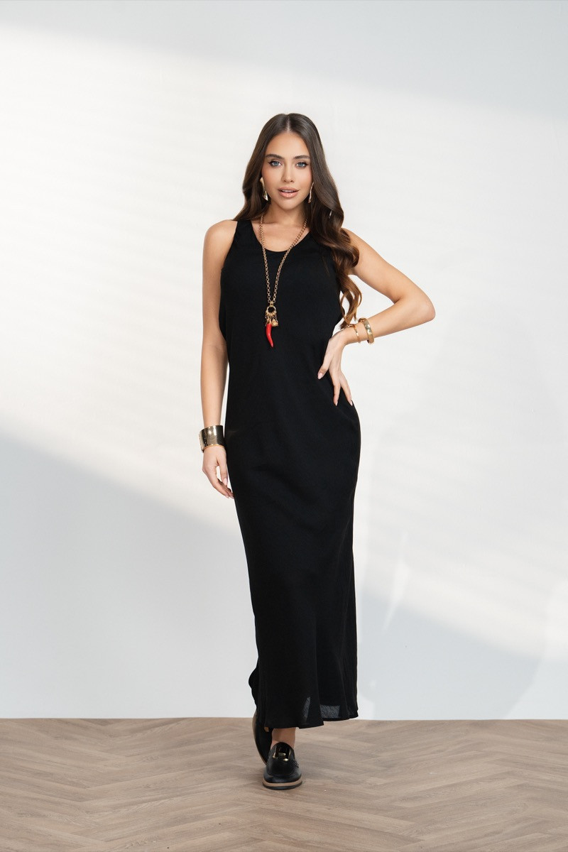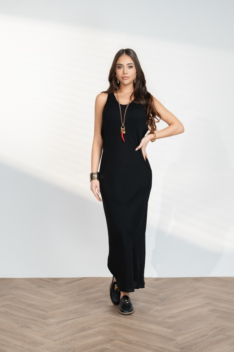 Елегантна дамска рокля с изчистен дизайн и издължен силует. Моделът е без ръкави и с права, свободно падаща линия, която придава стилна и минималистична визия. Черният цвят създава класическо и изискано излъчване, което прави роклята подходяща както за вечерни събития, така и за модерна ежедневна визия с аксесоари.