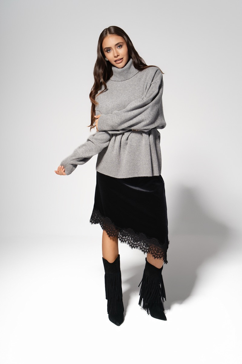 Елегантна кадифена рокля в дължина миди, която съчетава изтънченост и женственост. Мекото черно кадифе пада красиво по тялото, а фината дантела по деколтето и подгъва придава луксозен и деликатен акцент. Моделът е с тънки презрамки и изчистен силует, който подчертава фигурата по елегантен начин.Подходяща е както за вечерни излизания, така и за специални събития, когато искаш да се почувстваш женствена и стилна.