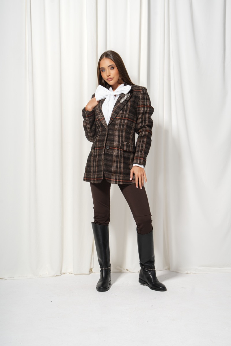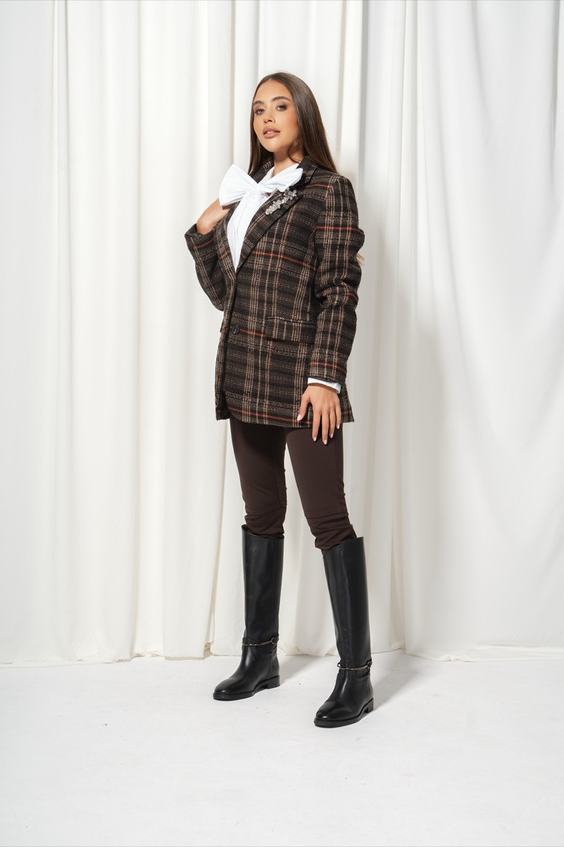 Brown Heritage Blazer е елегантно сако с класически кариран десен, което съчетава изискан стил и модерна женственост. Моделът е с втален силует, който красиво подчертава фигурата, и изчистена линия, подходяща както за офис визии, така и за по-елегантни градски комбинации. Фините цветни нишки в десена придават дълбочина и характер, а декоративната брошка добавя акцент и индивидуалност. Brown Heritage Blazer е перфектният избор за стилна визия с класическо излъчване и съвременно усещане.