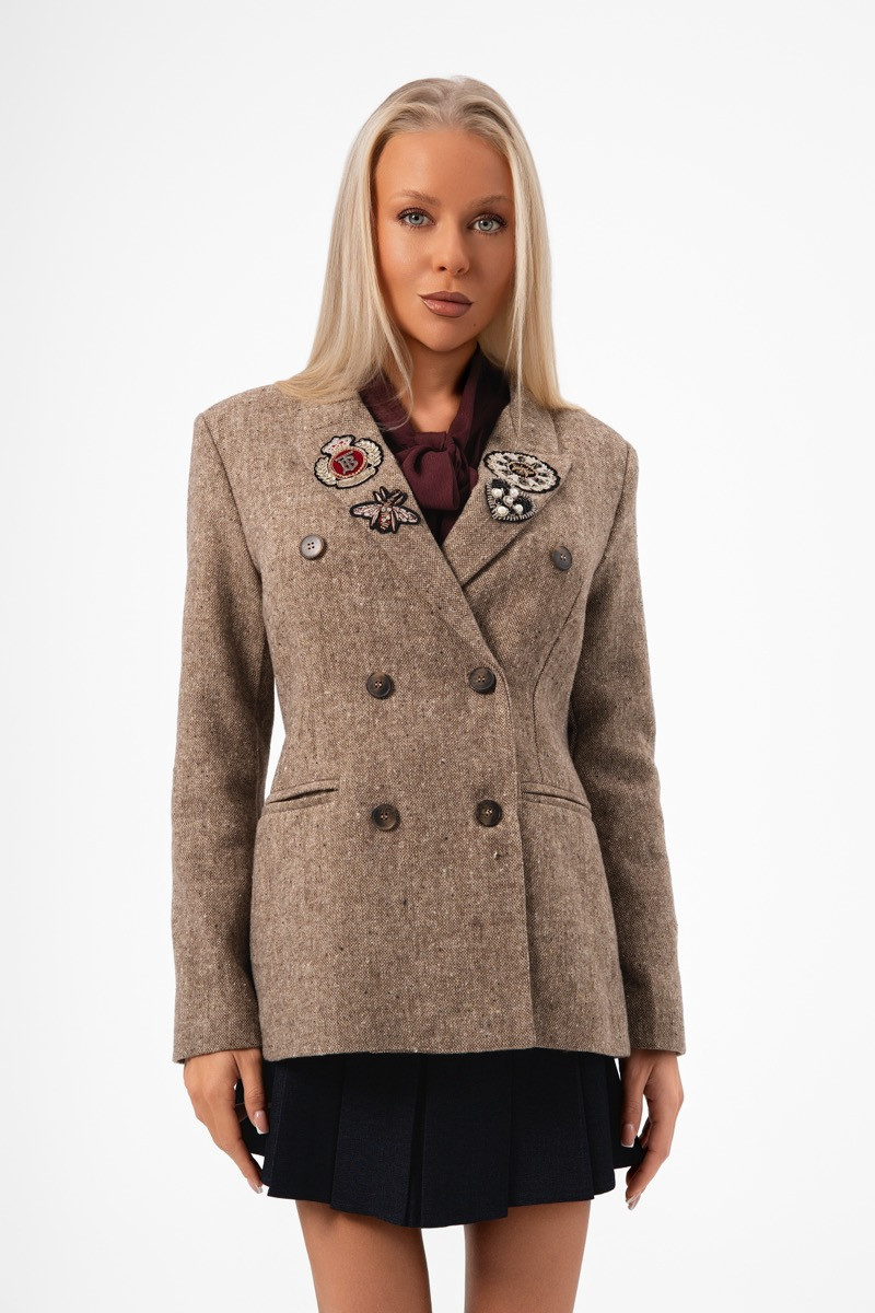 Елегантно сако от висококачествена вълнена смес в топъл кафяв меланж, вдъхновено от класическата британска естетика. Моделът е с двуредно закопчаване, подчертани рамене и изчистен силует, който придава изтънченост и структура на визията.Декоративните ръчно бродирани апликации и емблеми в горната част на сакото добавят артистичен акцент и превръщат дрехата в уникално fashion изявление. Джобовете с капаци и перфектната кройка съчетават елегантност и функционалност.