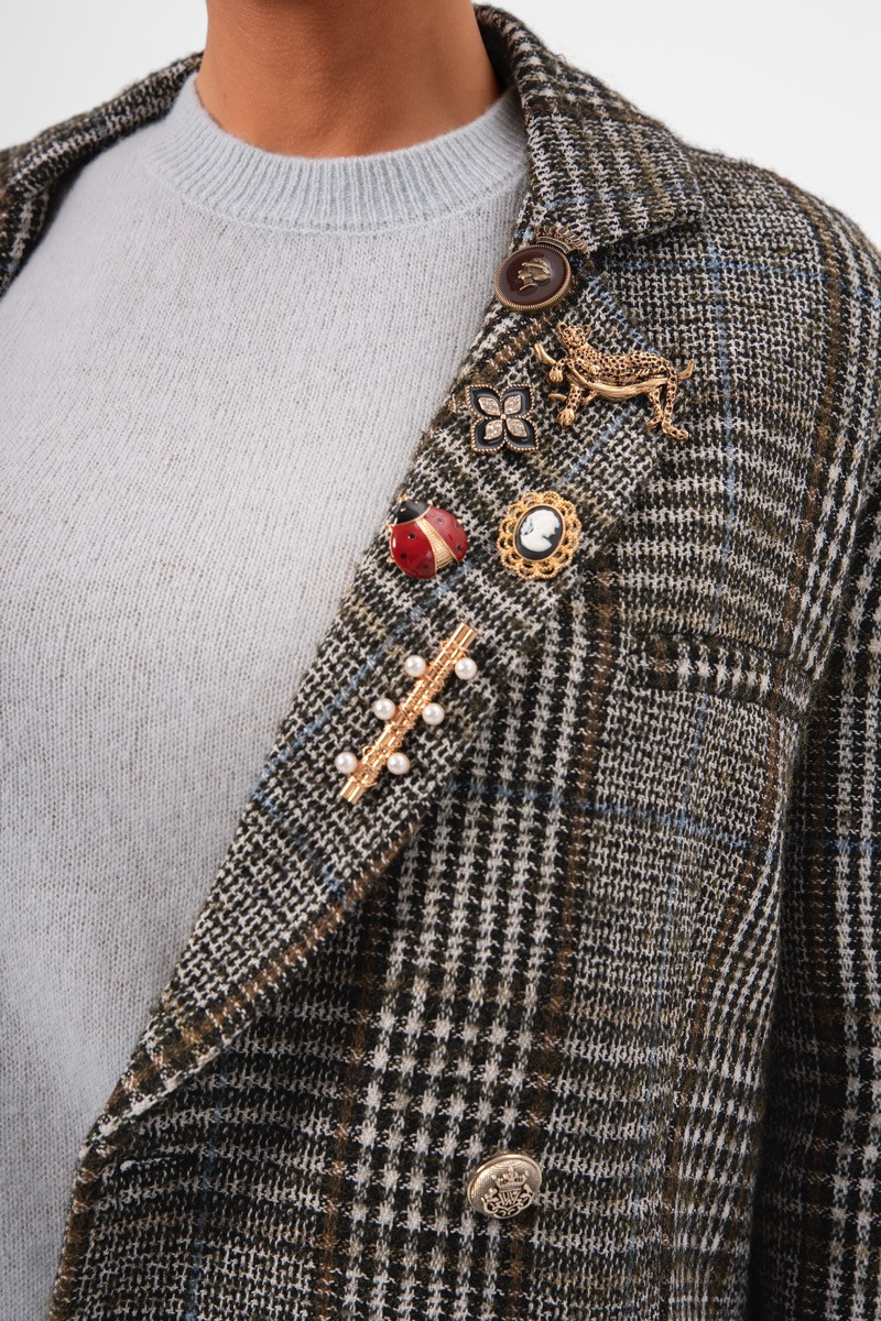 Преходно сако с изразена структура и модерен oversize силует. Изработено от висококачествена вълнена смес в класическо каре, което съчетава топлина и стил. Декоративните брошки придават индивидуален акцент и съвременна елегантност. Подходящо за есенни и пролетни визии.