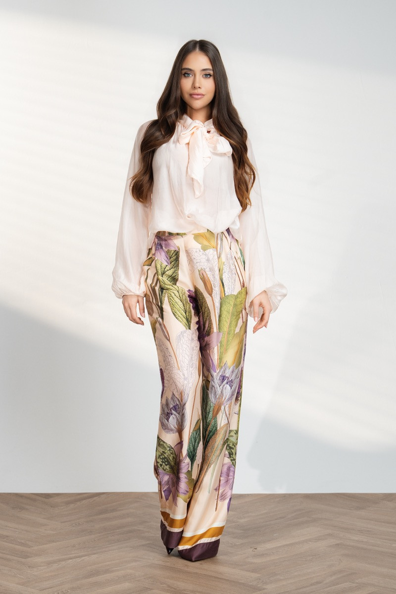 Елегантен дамски сет, състоящ се от ефирна блуза и стилен панталон с артистичен флорален принт. Блузата е изработена от лека и нежна материя и е завършена с елегантна панделка при деколтето, която придава изискан и романтичен акцент. Панталонът е с широка кройка и впечатляващ флорален дизайн, който създава свежа и модерна визия.