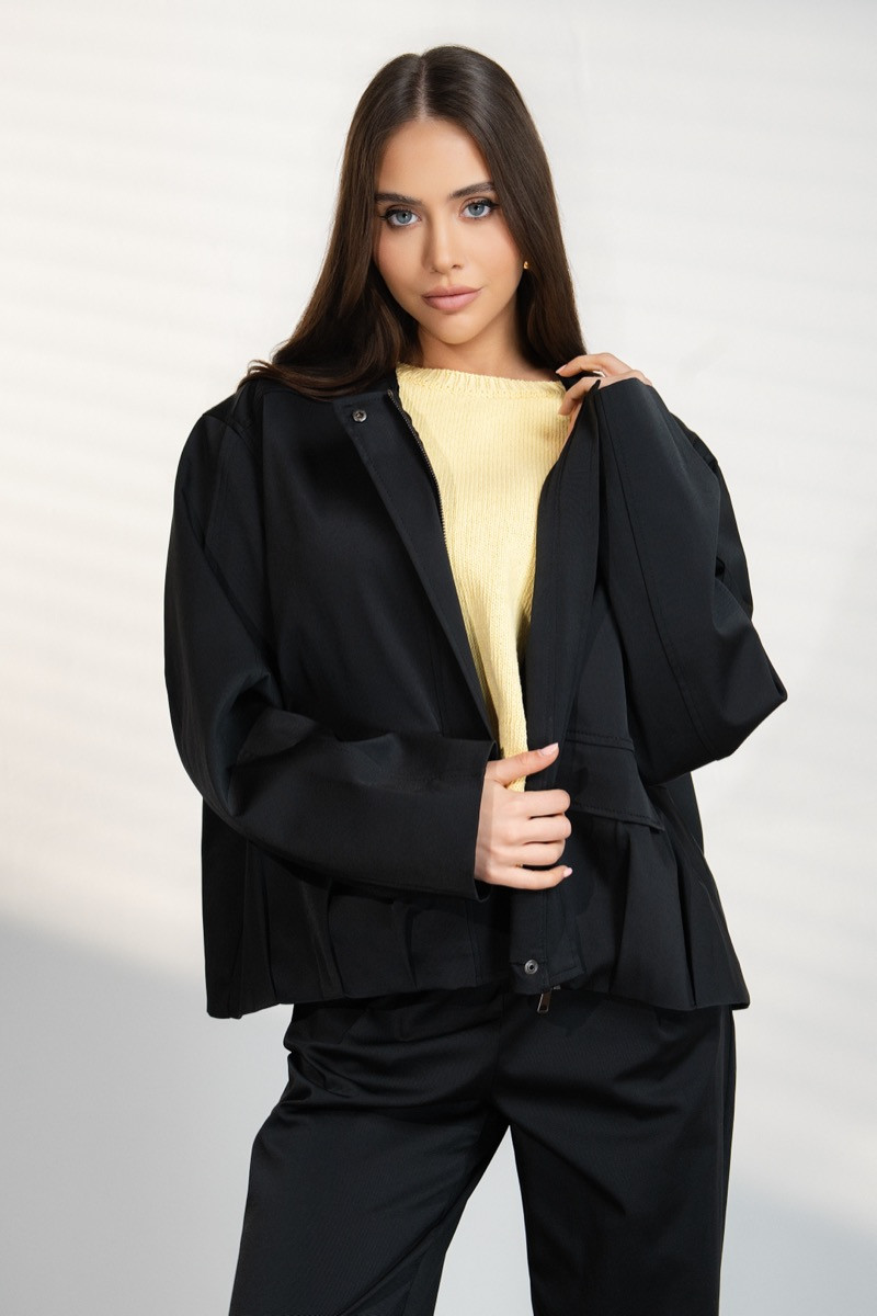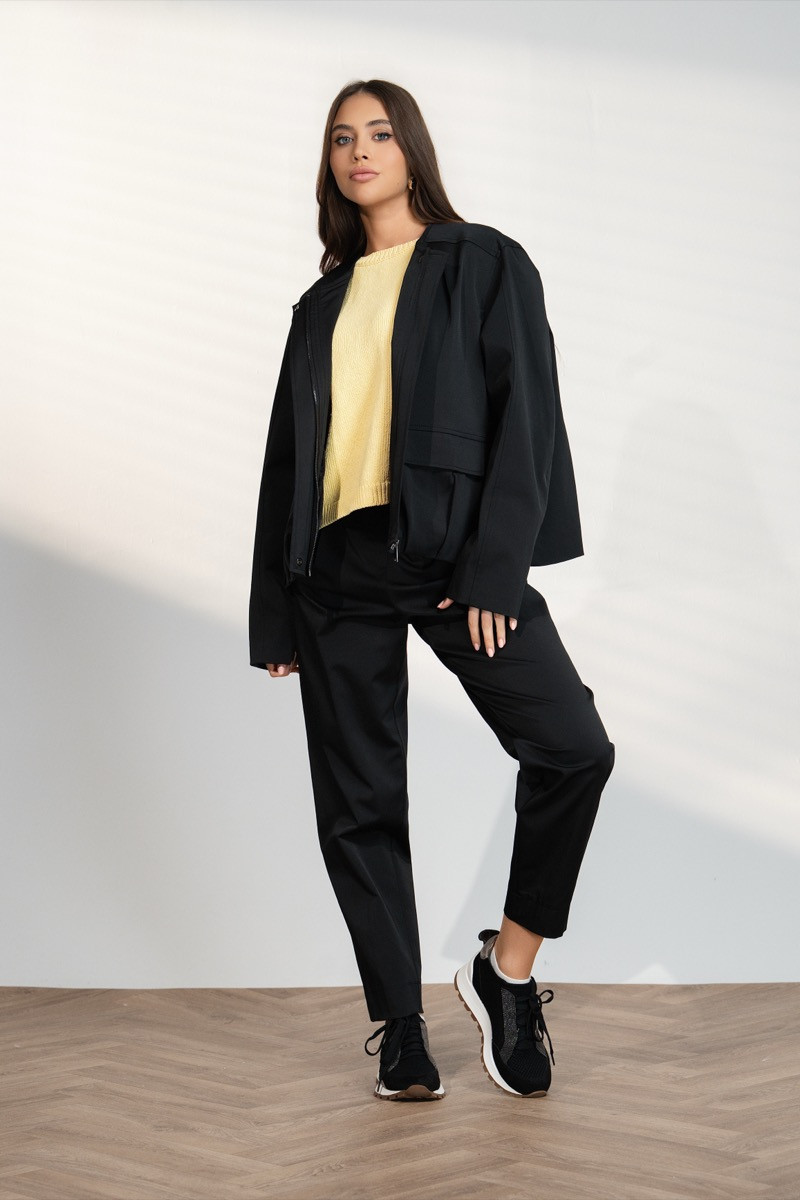 Модерен дамски комплект, състоящ се от яке и панталон, създаден за стилна и удобна визия. Якето е с по-свободна кройка, цип отпред и практични джобове, което придава съвременно и леко спортно излъчване. Панталонът е с изчистен силует и комфортна линия, която осигурява свобода на движение и елегантна визия.Комплектът е изработен от приятна материя и е подходящ както за ежедневни визии, така и за модерни градски комбинации със спортни обувки или по-елегантни аксесоари.