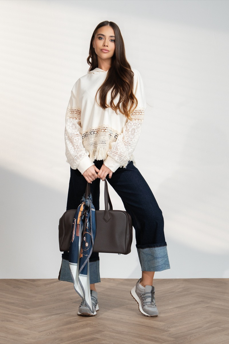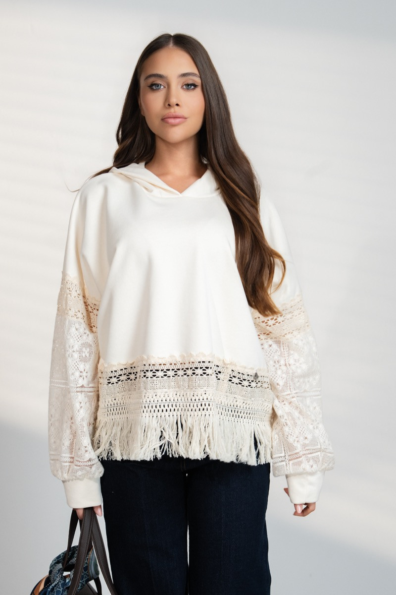 Стилен дамски суитчър в елегантен кремав цвят, съчетаващ комфорт и нежна женственост. Моделът е с качулка и свободна кройка, която осигурява удобство през целия ден. Ръкавите са украсени с фина дантела, придаваща романтичен и изискан акцент. Долната част е завършена с декоративни ресни и плетени детайли, които добавят бохо стил и оригиналност.