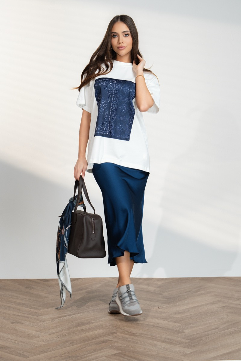 Стилна дамска тениска с модерна свободна кройка и ефектен декоративен принт в тъмносиньо. Моделът е с къс ръкав и изчистено кръгло деколте, което осигурява комфорт и лекота при носене. Контрастният принт отпред придава оригинален акцент и прави тениската чудесен избор за ежедневни и спортно-елегантни комбинации. Лесно се съчетава с панталони, дънки или поли за модерна градска визия.