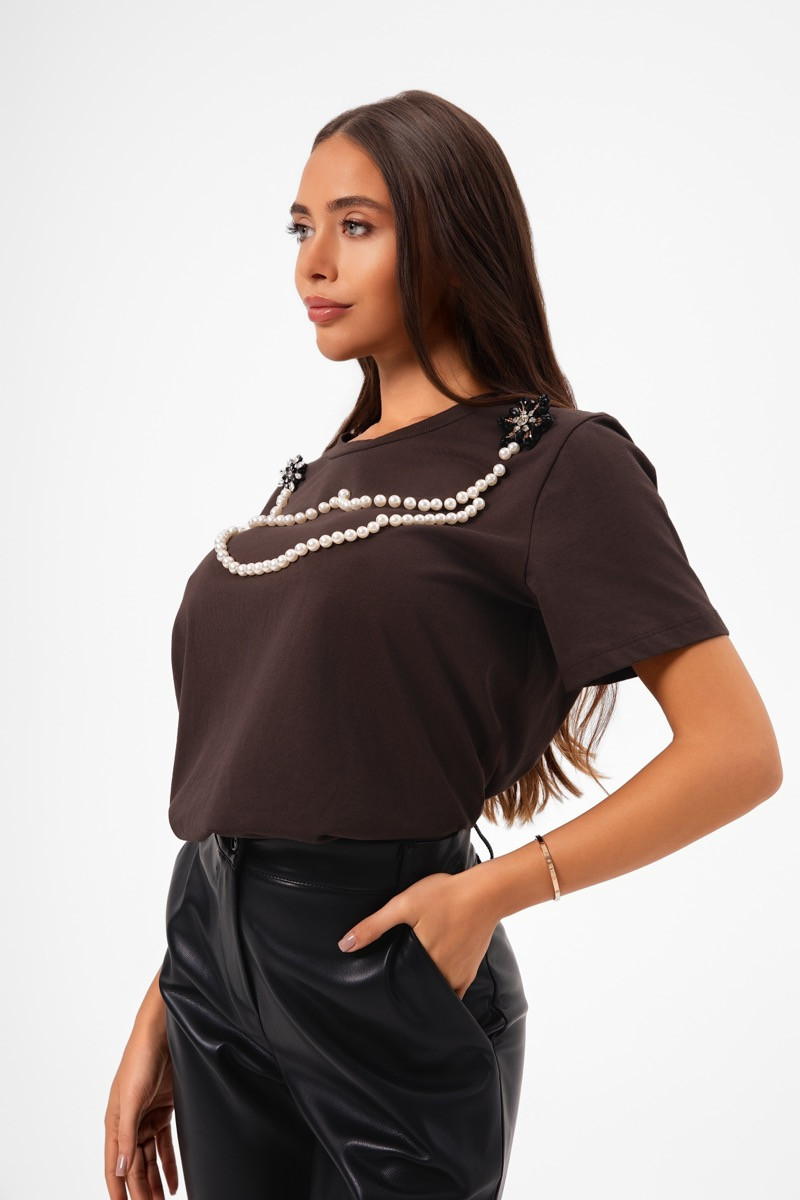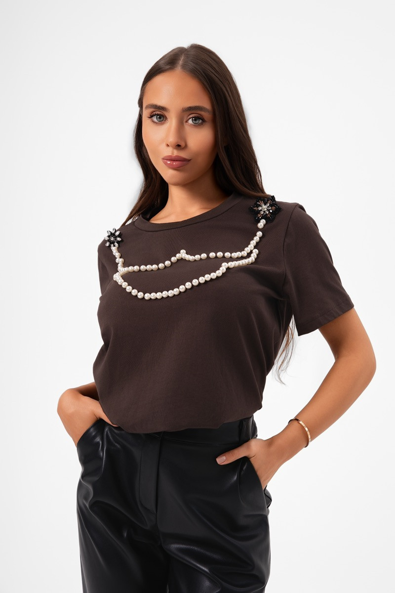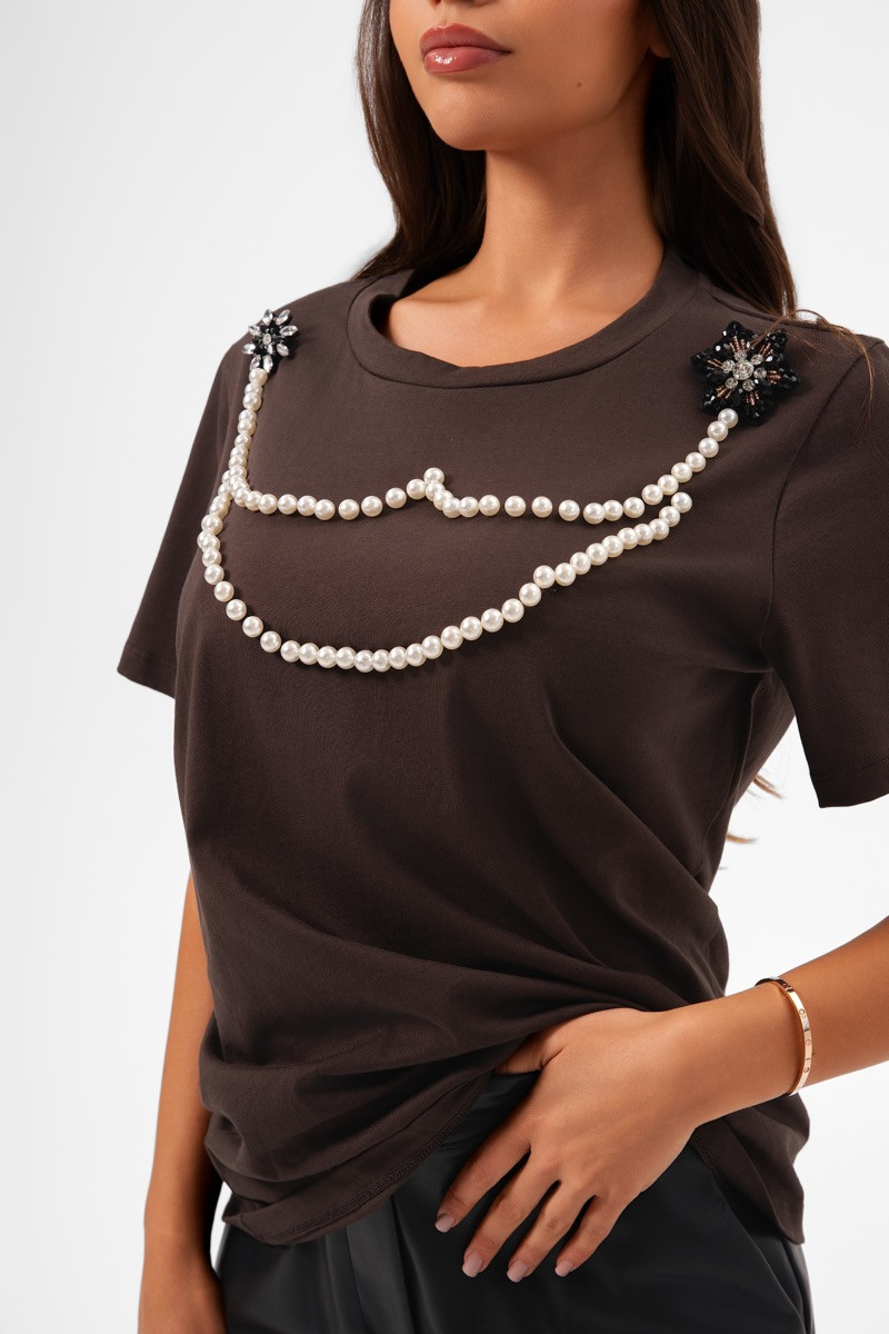 Класическа кафява тениска, изработена от мек памук с фин блясък. Акцентът от ръчно апликирани перли придава изискано, но съвременно излъчване. Моделът effortlessly съчетава ежедневен комфорт с нотка на лукс и женственост.
