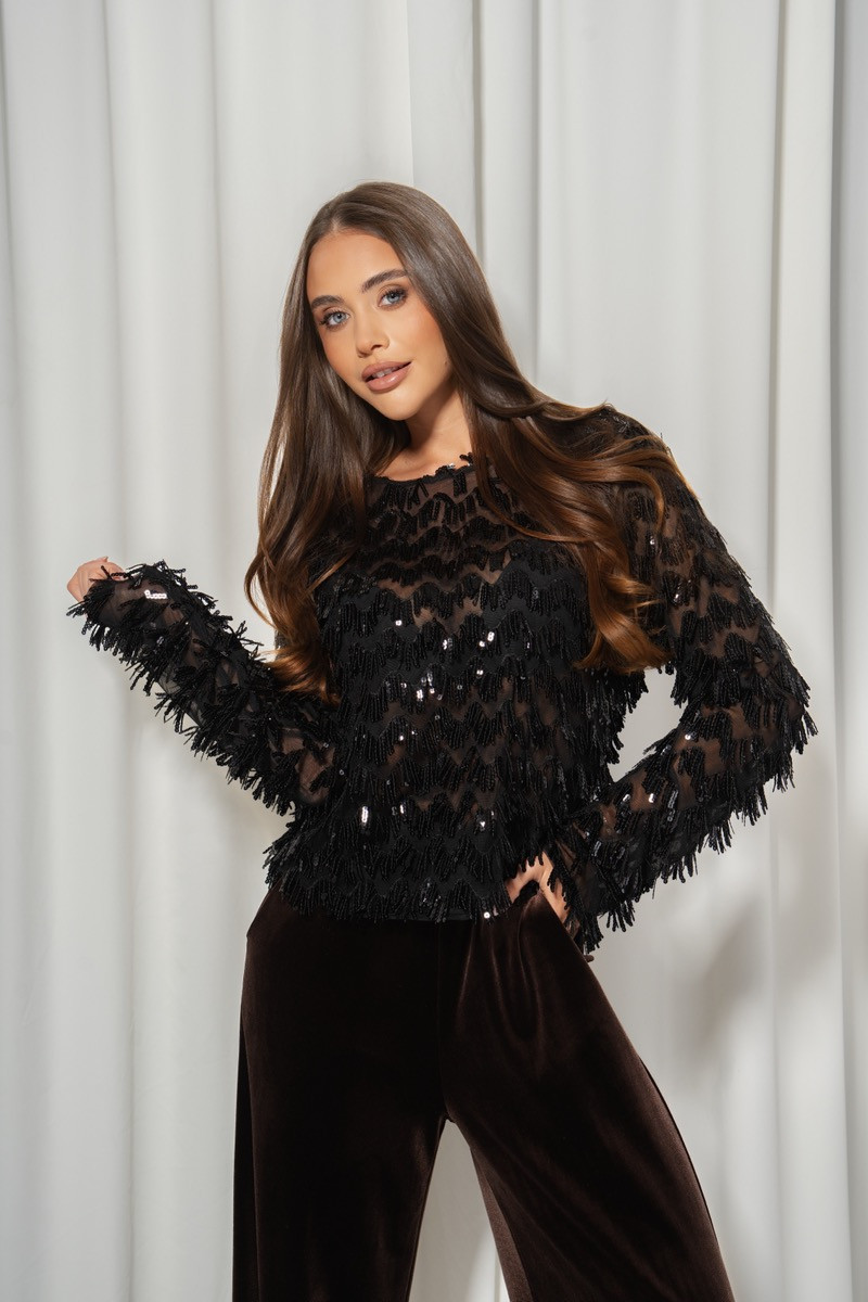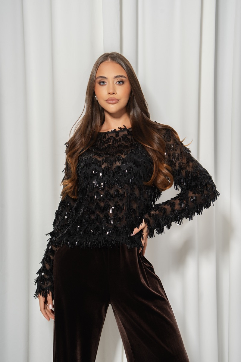 Black Fringe Sequin Blouse е ефектна и изключително стилна блуза, създадена за смели и запомнящи се визии. Изработена от фина мрежеста основа с богата декорация от ресни и пайети, тя създава динамично движение и деликатен блясък при всяка стъпка. Свободният силует осигурява комфорт, а дългите ръкави с ресни добавят драматичен и модерен акцент.